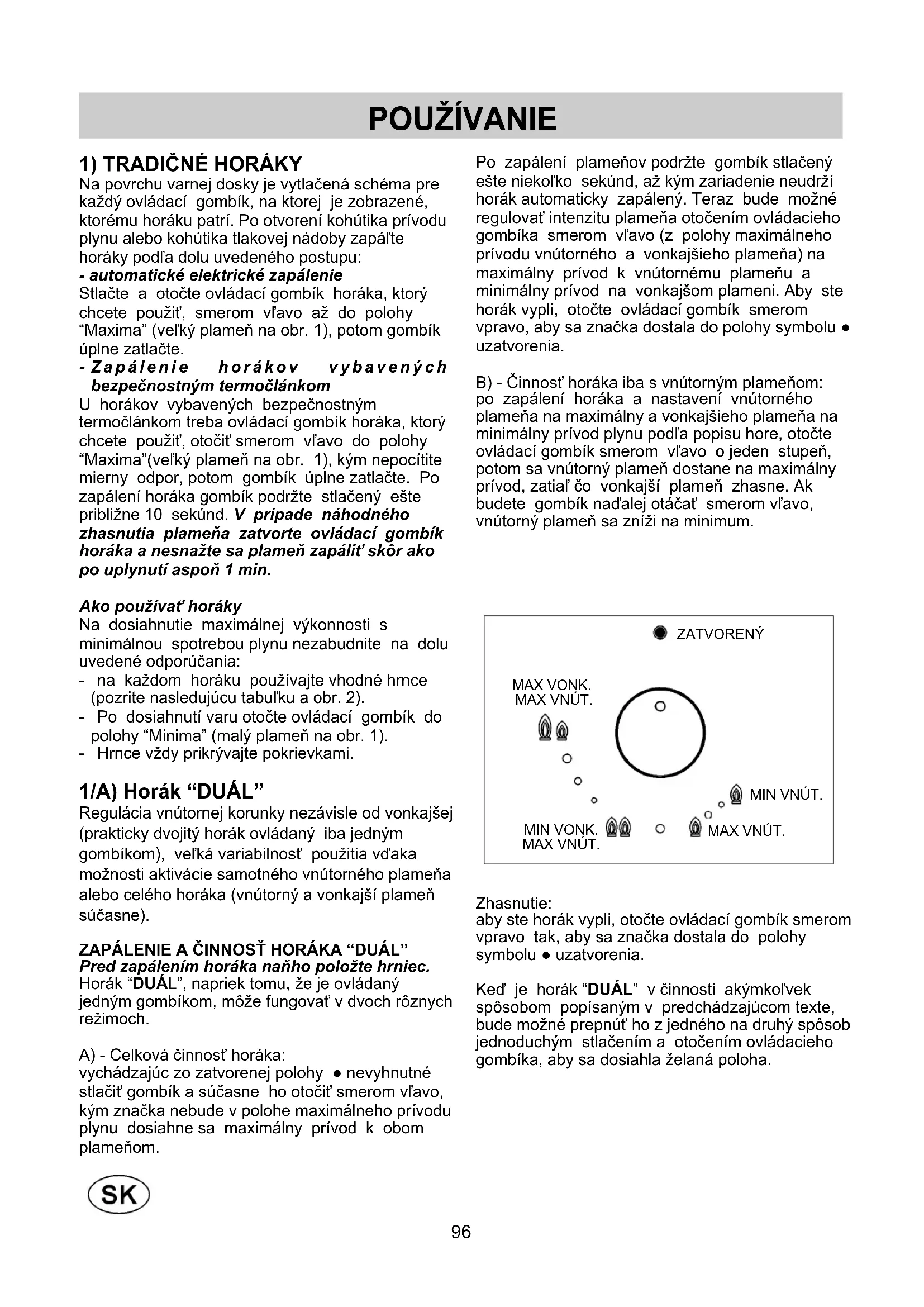 Na povrchu varnej dosky je vytlačená schéma pre každý ovládací gombík, na ktorej je zobrazené, ktorému horáku patrí. Po otvorení kohútika prívodu plynu alebo kohútika tlakovej nádoby zapáľte horáky podľa dolu uvedeného postupu: - automatické elektrické zapálenie Stlačte a otočte ovládací gombík horáka, ktorý chcete použiť, smerom vľavo až do polohy “Maxima” (veľký plameň na obr. 1), potom gombík úplne zatlačte. - Z a p á l e n i e h o r á k o v v y b a v e n ý c h bezpečnostným termočlánkom U horákov vybavených bezpečnostným termočlánkom treba ovládací gombík horáka, ktorý chcete použiť, otočiť smerom vľavo do polohy “Maxima”(veľký plameň na obr. 1), kým nepocítite mierny odpor, potom gombík úplne zatlačte. Po zapálení horáka gombík podržte stlačený ešte približne 10 sekúnd. V prípade náhodného zhasnutia plameňa zatvorte ovládací gombík horáka a nesnažte sa plameň zapáliť skôr ako po uplynutí aspoň 1 min. Ako používať horáky Na dosiahnutie maximálnej výkonnosti s minimálnou spotrebou plynu nezabudnite na dolu uvedené odporúčania: - na každom horáku používajte vhodné hrnce (pozrite nasledujúcu tabuľku a obr. 2). - Po dosiahnutí varu otočte ovládací gombík do polohy “Minima” (malý plameň na obr. 1). - Hrnce vždy prikrývajte pokrievkami. 1/A) Horák “DUÁL” Regulácia vnútornej korunky nezávisle od vonkajšej (prakticky dvojitý horák ovládaný iba jedným gombíkom), veľká variabilnosť použitia vďaka možnosti aktivácie samotného vnútorného plameňa alebo celého horáka (vnútorný a vonkajší plameň súčasne). ZAPÁLENIE A ČINNOSŤ HORÁKA “DUÁL” Pred zapálením horáka naňho položte hrniec. Horák “DUÁL”, napriek tomu, že je ovládaný jedným gombíkom, môže fungovať v dvoch rôznych režimoch. A) - Celková činnosť horáka: vychádzajúc zo zatvorenej polohy ● nevyhnutné stlačiť gombík a súčasne ho otočiť smerom vľavo, kým značka nebude v polohe maximálneho prívodu plynu dosiahne sa maximálny prívod k obom plameňom. Po zapálení plameňov podržte gombík stlačený ešte niekoľko sekúnd, až kým zariadenie neudrží horák automaticky zapálený. Teraz bude možné regulovať intenzitu plameňa otočením ovládacieho gombíka smerom vľavo (z polohy maximálneho prívodu vnútorného a vonkajšieho plameňa) na maximálny prívod k vnútornému plameňu a minimálny prívod na vonkajšom plameni. Aby ste horák vypli, otočte ovládací gombík smerom vpravo, aby sa značka dostala do polohy symbolu ● uzatvorenia. B) - Činnosť horáka iba s vnútorným plameňom: po zapálení horáka a nastavení vnútorného plameňa na maximálny a vonkajšieho plameňa na minimálny prívod plynu podľa popisu hore, otočte ovládací gombík smerom vľavo o jeden stupeň, potom sa vnútorný plameň dostane na maximálny prívod, zatiaľ čo vonkajší plameň zhasne. Ak budete gombík naďalej otáčať smerom vľavo, vnútorný plameň sa zníži na minimum. Zhasnutie: aby ste horák vypli, otočte ovládací gombík smerom vpravo tak, aby sa značka dostala do polohy symbolu ● uzatvorenia. Keď je horák “DUÁL” v činnosti akýmkoľvek spôsobom popísaným v predchádzajúcom texte, bude možné prepnúť ho z jedného na druhý spôsob jednoduchým stlačením a otočením ovládacieho gombíka, aby sa dosiahla želaná poloha. POUŽÍVANIE ZATVORENÝ MIN VNÚT. MAX VNÚT. MAX VONK. MAX VNÚT. MIN VONK.