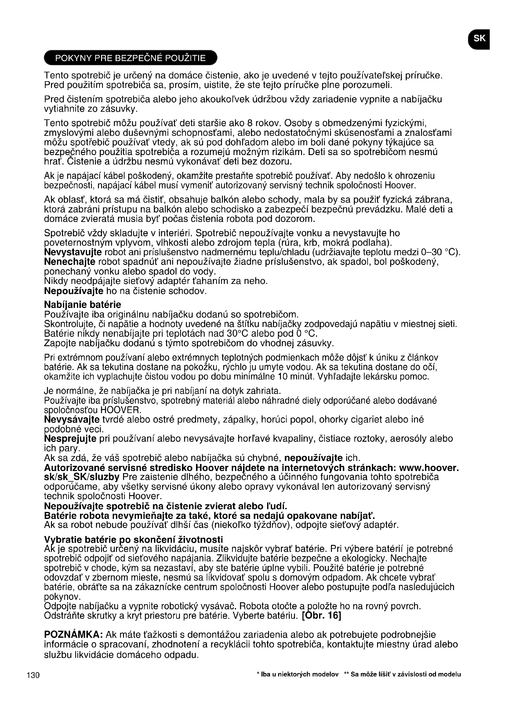 Tento spotrebič je určený na domáce čistenie, ako je uvedené v tejto používateľskej príručke. Pred použitím spotrebiča sa, prosím, uistite, že ste tejto príručke plne porozumeli. Pred čistením spotrebiča alebo jeho akoukoľvek údržbou vždy zariadenie vypnite a nabíjačku vytiahnite zo zásuvky. Tento spotrebič môžu používať deti staršie ako 8 rokov. Osoby s obmedzenými fyzickými, zmyslovými alebo duševnými schopnosťami, alebo nedostatočnými skúsenosťami a znalosťami môžu spotřebič používať vtedy, ak sú pod dohľadom alebo im boli dané pokyny týkajúce sa bezpečného použitia spotrebiča a rozumejú možným rizikám. Deti sa so spotrebičom nesmú hrať. Čistenie a údržbu nesmú vykonávať deti bez dozoru. Ak je napájací kábel poškodený, okamžite prestaňte spotrebič používať. Aby nedošlo k ohrozeniu bezpečnosti, napájací kábel musí vymeniť autorizovaný servisný technik spoločnosti Hoover. Ak oblasť, ktorá sa má čistiť, obsahuje balkón alebo schody, mala by sa použiť fyzická zábrana, ktorá zabráni prístupu na balkón alebo schodisko a zabezpečí bezpečnú prevádzku. Malé deti a domáce zvieratá musia byť počas čistenia robota pod dozorom. Spotrebič vždy skladujte v interiéri. Spotrebič nepoužívajte vonku a nevystavujte ho poveternostným vplyvom, vlhkosti alebo zdrojom tepla (rúra, krb, mokrá podlaha). Nevystavujte robot ani príslušenstvo nadmernému teplu/chladu (udržiavajte teplotu medzi 0–30 °C). Nenechajte robot spadnúť ani nepoužívajte žiadne príslušenstvo, ak spadol, bol poškodený, ponechaný vonku alebo spadol do vody. Nikdy neodpájajte sieťový adaptér ťahaním za neho. Nepoužívajte ho na čistenie schodov. Nabíjanie batérie Používajte iba originálnu nabíjačku dodanú so spotrebičom. Skontrolujte, či napätie a hodnoty uvedené na štítku nabíjačky zodpovedajú napätiu v miestnej sieti. Batérie nikdy nenabíjajte pri teplotách nad 30°C alebo pod 0 °C. Zapojte nabíjačku dodanú s týmto spotrebičom do vhodnej zásuvky. Pri extrémnom používaní alebo extrémnych teplotných podmienkach môže dôjsť k úniku z článkov batérie. Ak sa tekutina dostane na pokožku, rýchlo ju umyte vodou. Ak sa tekutina dostane do očí, okamžite ich vyplachujte čistou vodou po dobu minimálne 10 minút. Vyhľadajte lekársku pomoc. Je normálne, že nabíjačka je pri nabíjaní na dotyk zahriata. Používajte iba príslušenstvo, spotrebný materiál alebo náhradné diely odporúčané alebo dodávané spoločnosťou HOOVER. Nevysávajte tvrdé alebo ostré predmety, zápalky, horúci popol, ohorky cigariet alebo iné podobné veci. Nesprejujte pri používaní alebo nevysávajte horľavé kvapaliny, čistiace roztoky, aerosóly alebo ich pary. Ak sa zdá, že váš spotrebič alebo nabíjačka sú chybné, nepoužívajte ich. Autorizované servisné stredisko Hoover nájdete na internetových stránkach: www.hoover. sk/sk_SK/sluzby Pre zaistenie dlhého, bezpečného a účinného fungovania tohto spotrebiča odporúčame, aby všetky servisné úkony alebo opravy vykonával len autorizovaný servisný technik spoločnosti Hoover. Nepoužívajte spotrebič na čistenie zvierat alebo ľudí. Batérie robota nevymieňajte za také, ktoré sa nedajú opakovane nabíjať. Ak sa robot nebude používať dlhší čas (niekoľko týždňov), odpojte sieťový adaptér. Vybratie batérie po skončení životnosti Ak je spotrebič určený na likvidáciu, musíte najskôr vybrať batérie. Pri výbere batérií je potrebné spotrebič odpojiť od sieťového napájania. Zlikvidujte batérie bezpečne a ekologicky. Nechajte spotrebič v chode, kým sa nezastaví, aby ste batérie úplne vybili. Použité batérie je potrebné odovzdať v zbernom mieste, nesmú sa likvidovať spolu s domovým odpadom. Ak chcete vybrať batérie, obráťte sa na zákaznícke centrum spoločnosti Hoover alebo postupujte podľa nasledujúcich pokynov. Odpojte nabíjačku a vypnite robotický vysávač. Robota otočte a položte ho na rovný povrch. Odstráňte skrutky a kryt priestoru pre batérie. Vyberte batériu. [Obr. 16] POZNÁMKA: Ak máte ťažkosti s demontážou zariadenia alebo ak potrebujete podrobnejšie informácie o spracovaní, zhodnotení a recyklácii tohto spotrebiča, kontaktujte miestny úrad alebo službu likvidácie domáceho odpadu.