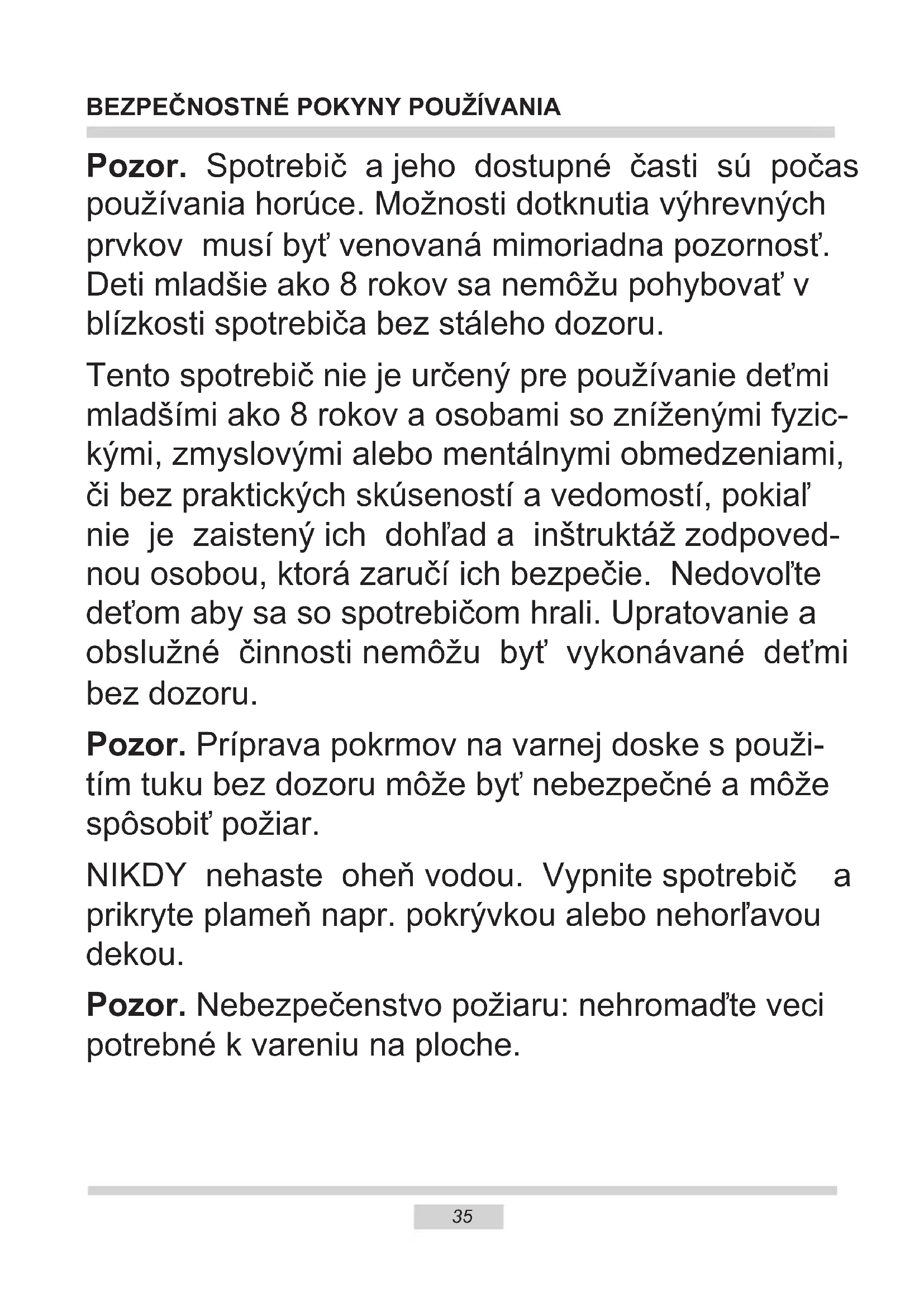 Pozor. Spotrebič a jeho dostupné časti sú počas používania horúce. Možnosti dotknutia výhrevných prvkov musí byť venovaná mimoriadna pozornosť. Deti mladšie ako 8 rokov sa nemôžu pohybovať v blízkosti spotrebiča bez stáleho dozoru. Tento spotrebič nie je určený pre používanie deťmi mladšími ako 8 rokov a osobami so zníženými fyzic- kými, zmyslovými alebo mentálnymi obmedzeniami, či bez praktických skúseností a vedomostí, pokiaľ nie je zaistený ich dohľad a inštruktáž zodpoved- nou osobou, ktorá zaručí ich bezpečie. Nedovoľte deťom aby sa so spotrebičom hrali. Upratovanie a obslužné činnosti nemôžu byť vykonávané deťmi bez dozoru. Pozor. Príprava pokrmov na varnej doske s použi- tím tuku bez dozoru môže byť nebezpečné a môže spôsobiť požiar. NIKDY nehaste oheň vodou. Vypnite spotrebič a prikryte plameň napr. pokrývkou alebo nehorľavou dekou. Pozor. Nebezpečenstvo požiaru: nehromaďte veci potrebné k vareniu na ploche.36