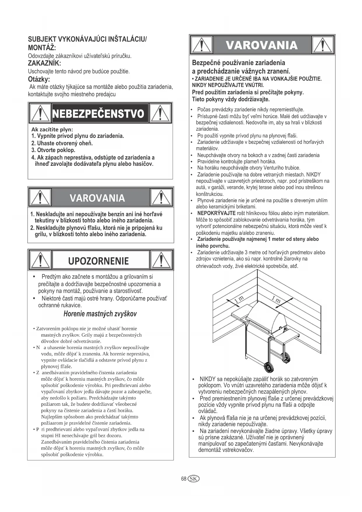 - ZARIADENIE JE URČENÉ IBA NA VONKAJŠIE POUŽITIE.NIKDY NEPOUŽÍVAJTE VNÚTRI. Pred použitím zariadenia si prečítajte pokyny. Tieto pokyny vždy dodržiavajte. Ÿ Počas prevádzky zariadenie nikdy nepremiestňujte.Ÿ Prístupné časti môžu byť veľmi horúce. Malé deti udržiavajte vbezpečnej vzdialenosti. Nedovoľte im, aby sa hrali v blízkostizariadenia.Ÿ Po použití vypnite prívod plynu na plynovej fľaši.Ÿ Zariadenie udržiavajte v bezpečnej vzdialenosti od horľavýchmateriálov.Ÿ Neupchávajte otvory na bokoch a v zadnej časti zariadeniaŸ Pravidelne kontrolujte plameň horáka.Ÿ Na horáku neupchávajte otvory Venturiho trubice.Ÿ Zariadenie používajte na dobre vetraných miestach. NIKDYnepoužívajte v uzavretých priestoroch, napr. pod prístreškom naautá, v garáži, verande, krytej terase alebo pod inou strešnoukonštrukciou.Ÿ Plynové zariadenie nie je určené na použitie s dreveným uhlímalebo keramickými briketami.Ÿ NEPOKRÝVAJTE rošt hliníkovou fóliou alebo iným materiálom.Môže to spôsobiť zablokovanie odvetrávania horáka, týmvytvoriť potencionálne nebezpečnú situáciu, ktorá môže viesť kpoškodeniu majetku a/alebo zraneniu.Ÿ Zariadenie používajte najmenej 1 meter od steny aleboiného povrchu.Ÿ Zariadenie udržiavajte 3 metre od horľavých predmetov alebozdrojov vznietenia, ako sú napr. kontrolné žiarovky na ohrievačoch vody, živé elektrické spotrebiče, atď.Ÿ NIKDY sa nepokúšajte zapáliť horák so zatvoreným poklopom. Vo vnútri uzavretého zariadenia môže dôjsť k vytvoreniu nebezpečných nezapálených plynov. Ÿ Pred premiestnením plynovej fľaše z určenej prevádzkovej pozície vždy vypnite prívod plynu na fľaši a odpojte ovládač. Ÿ Ak plynová fľaša nie je na určenej prevádzkovej pozícii, nikdy zariadenie nepoužívajte. Ÿ Na zariadení nevykonávajte žiadne úpravy. Všetky úpravy sú prísne zakázané. Užívateľ nie je oprávnený manipulovať so zapečatenými časťami. Nevykonávajte demontáž vstrekovačov.