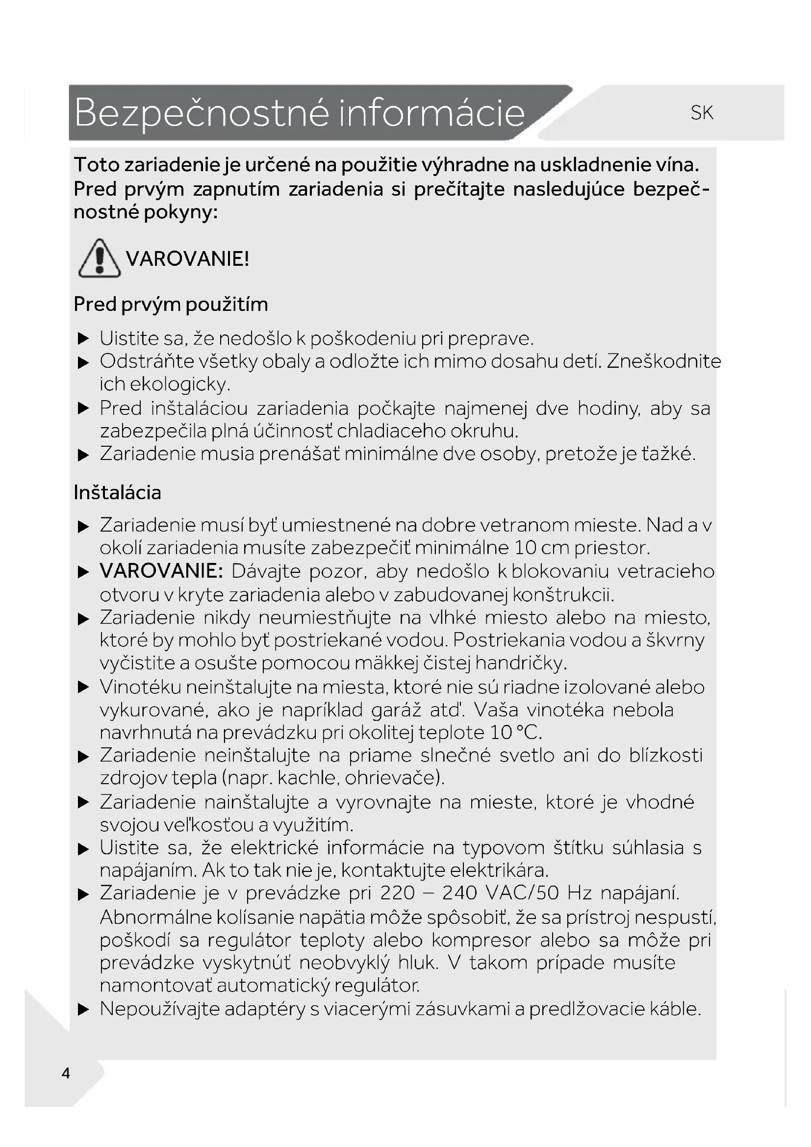 Toto zariadenie je určené na použitie výhradne na uskladnenie vína. Pred prvým zapnutím zariadenia si prečítajte nasledujúce bezpeč- nostné pokyny: