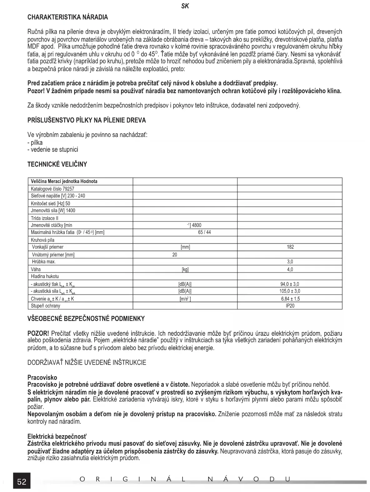 . Ťatie môže byť vykonáváné len pozdľž priamé čiary. Nesmi sa vykonáváť ťatia pozdľž krivky (napríklad po kruhu), pretože môže to hroziť nehodou buď zničeniem pily a elektronáradia.Spravná, spolehlivá a bezpečná práce náradi je závislá na náležite exploatáci, preto: Pred začatiem práce z nárádim je potreba prečítať celý návod k obsluhe a dodržiavať predpisy. Pozor! V žadném pripade nesmi sa použivať náradia bez namontovaných ochran kotúčové pily i rozštěpovácíeho klina. Za škody vznikle nedodržením bezpečnostních predpisov i pokynov teto inštrukce, dodavatel neni zodpovedný. PRÍSLUŠENSTVO PÍLKY NA PÍLENIE DREVA Ve výrobním zabaleniu je povinno sa nachádzať: - pílka - vedenie se stupnici