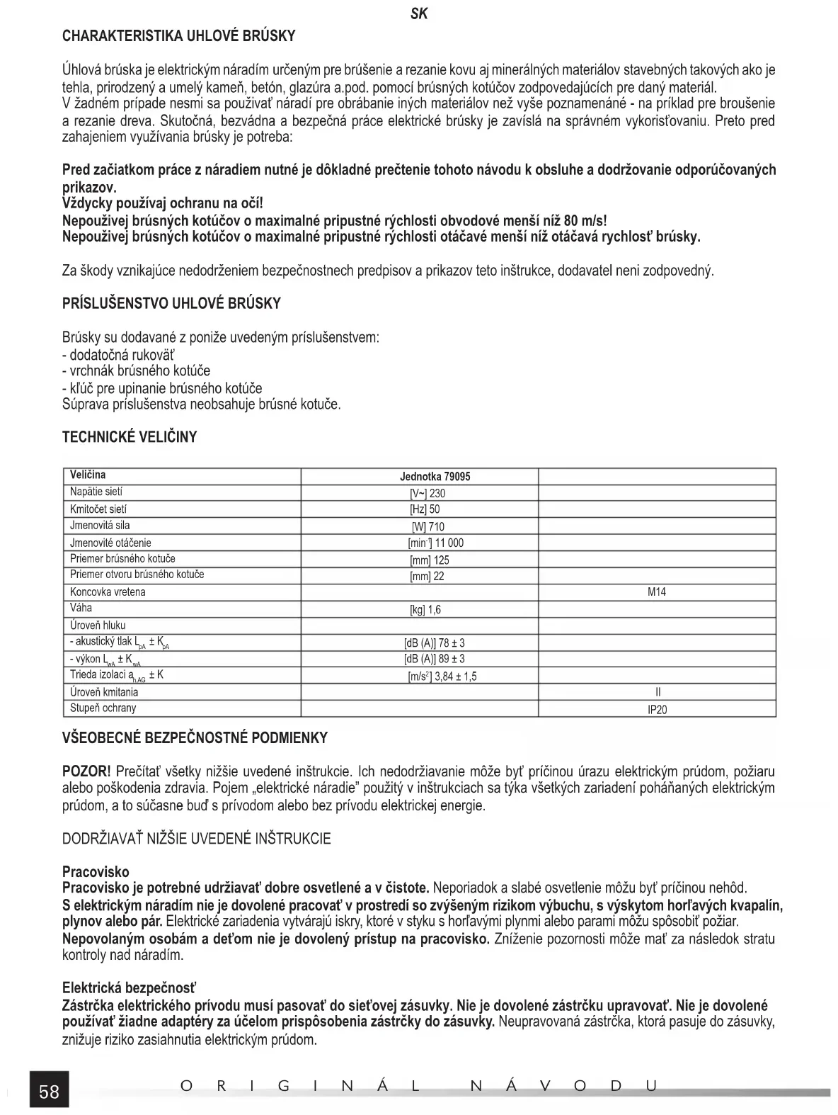 Úhlová brúska je elektrickým náradím určeným pre brúšenie a rezanie kovu aj minerálných materiálov stavebných takových ako je tehla, prirodzený a umelý kameň, betón, glazúra a.pod. pomocí brúsných kotúčov zodpovedajúcích pre daný materiál. V žadném prípade nesmi sa použivať náradí pre obrábanie iných materiálov než vyše poznamenáné - na príklad pre broušenie a rezanie dreva. Skutočná, bezvádna a bezpečná práce elektrické brúsky je zavíslá na správném vykorisťovaniu. Preto pred zahajeniem využívania brúsky je potreba: Pred začiatkom práce z náradiem nutné je dôkladné prečtenie tohoto návodu k obsluhe a dodržovanie odporúčovaných prikazov. Vždycky používaj ochranu na očí! Nepouživej brúsných kotúčov o maximalné pripustné rýchlosti obvodové menší níž 80 m/s! Nepouživej brúsných kotúčov o maximalné pripustné rýchlosti otáčavé menší níž otáčavá rychlosť brúsky. Za škody vznikajúce nedodrženiem bezpečnostnech predpisov a prikazov teto inštrukce, dodavatel neni zodpovedný.