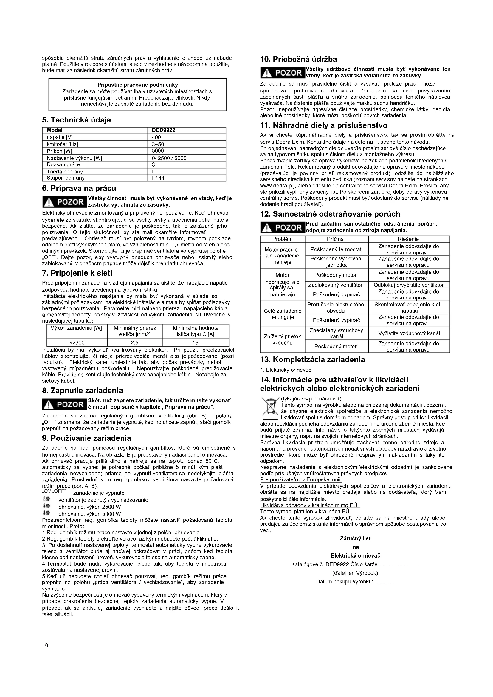 Elektrický ohrievač Katalógové č :DED9922 Číslo šarže: .......................... (ďalej len Výrobok) Dátum nákupu výrobku: .............11 Pečiatka predajcu Dátum a podpis predajcu: ................................. Vyhlásenie Užívateľa: Potvrdzujem, že som bol oboznámený so záručnými podmienkami, ako aj s následkami nedodržiavania pokynov a odporúčaní, ktoré sú uvedené v užívateľskej príručke a v záručnom liste. Záručné podmienky sú mi známe, čo potvrdzujem vlastnoručným podpisom: