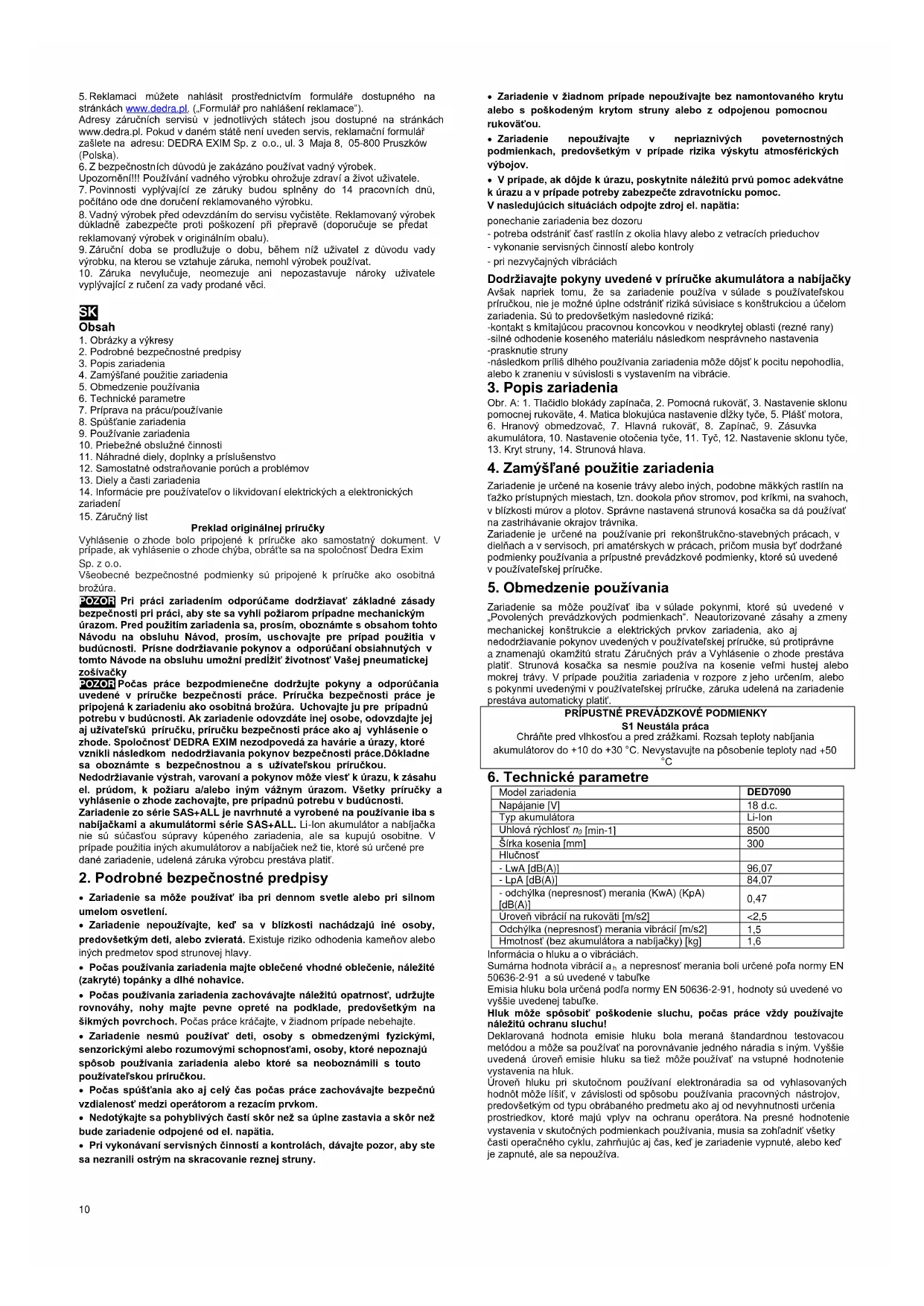Zariadenie série SAS+ALL sa môže používať s každým akumulátorom a nabíjačkou série SAS+ALL. Aby ste si vybrali správny akumulátor a nabíjačku, odporúčame, aby ste sa oboznámili s ponukou Dedra Exim na webovej stránke www.dedra.pl. Dodatočne ponúkame: - DED70901 – kotúč so strunou Keď chcete kúpiť náhradné diely alebo príslušenstvo, obráťte sa na servis Dedra Exim. Kontaktné údaje sú uvedené na 1. strane príručky. Pri objednávaní náhradných dielov vždy uveďte číslo šarže/série, ktoré je uvedené na výrobnom štítku, ako aj číslo dielu, ktoré je uvedené na schematickom nákrese zariadenia. Počas trvania záručnej lehoty sú prípadné opravy vykonávané podľa zásad uvedených v záručnom liste. Reklamovaný výrobok odovzdajte na opravu v mieste nákupu (predajca je povinný prijať reklamovaný výrobok), alebo ho zašlite do centrálneho servisu Dedra Exim alebo do servisu, ktorý je najbližšie pri mieste nákupu (zoznam servisov nájdete na webovom sídle www.dedra.pl). Pripojte vyplnený záručný list. Prosíme, nezabudnite na to. Po skončení záručnej lehoty opravy vykonáva centrálny servis. Poškodený výrobok pošlite do servisu (náklady na zásielku hradí užívateľ).