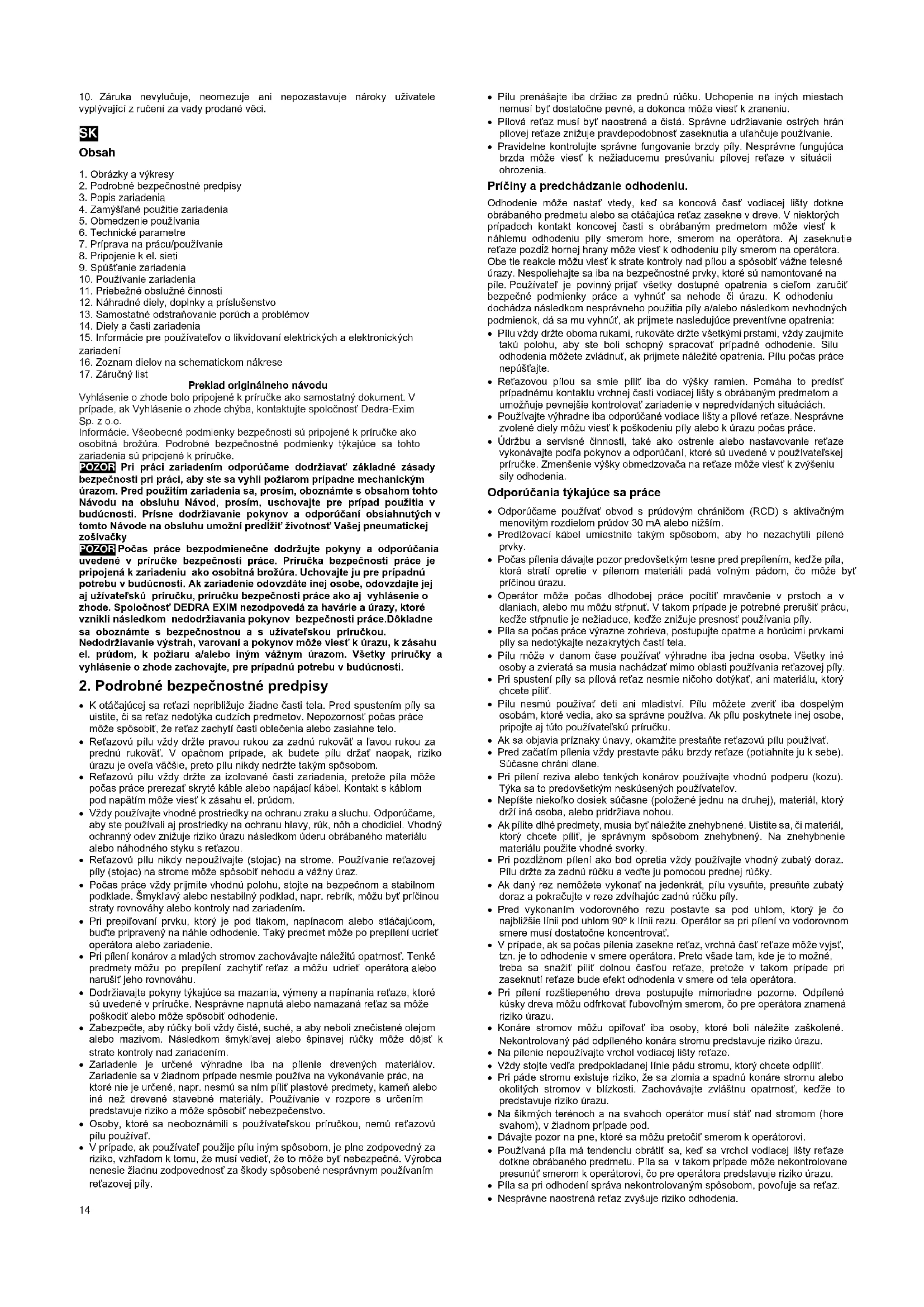 Preklad originálneho návodu Vyhlásenie o zhode bolo pripojené k príručke ako samostatný dokument. V prípade, ak Vyhlásenie o zhode chýba, kontaktujte spoločnosť Dedra-Exim Sp. z o.o. Informácie. Všeobecné podmienky bezpečnosti sú pripojené k príručke ako osobitná brožúra. Podrobné bezpečnostné podmienky týkajúce sa tohto zariadenia sú pripojené k príručke. POZOR Pri práci zariadením odporúčame dodržiavať základné zásady bezpečnosti pri práci, aby ste sa vyhli požiarom prípadne mechanickým úrazom. Pred použitím zariadenia sa, prosím, oboznámte s obsahom tohto Návodu na obsluhu Návod, prosím, uschovajte pre prípad použitia v budúcnosti. Prísne dodržiavanie pokynov a odporúčaní obsiahnutých v tomto Návode na obsluhu umožní predĺžiť životnosť Vašej pneumatickej zošívačky POZOR Počas práce bezpodmienečne dodržujte pokyny a odporúčania uvedené v príručke bezpečnosti práce. Príručka bezpečnosti práce je pripojená k zariadeniu ako osobitná brožúra. Uchovajte ju pre prípadnú potrebu v budúcnosti. Ak zariadenie odovzdáte inej osobe, odovzdajte jej aj užívateľskú príručku, príručku bezpečnosti práce ako aj vyhlásenie o zhode. Spoločnosť DEDRA EXIM nezodpovedá za havárie a úrazy, ktoré vznikli následkom nedodržiavania pokynov bezpečnosti práce.Dôkladne sa oboznámte s bezpečnostnou a s užívateľskou príručkou. Nedodržiavanie výstrah, varovaní a pokynov môže viesť k úrazu, k zásahu el. prúdom, k požiaru a/alebo iným vážnym úrazom. Všetky príručky a vyhlásenie o zhode zachovajte, pre prípadnú potrebu v budúcnosti.