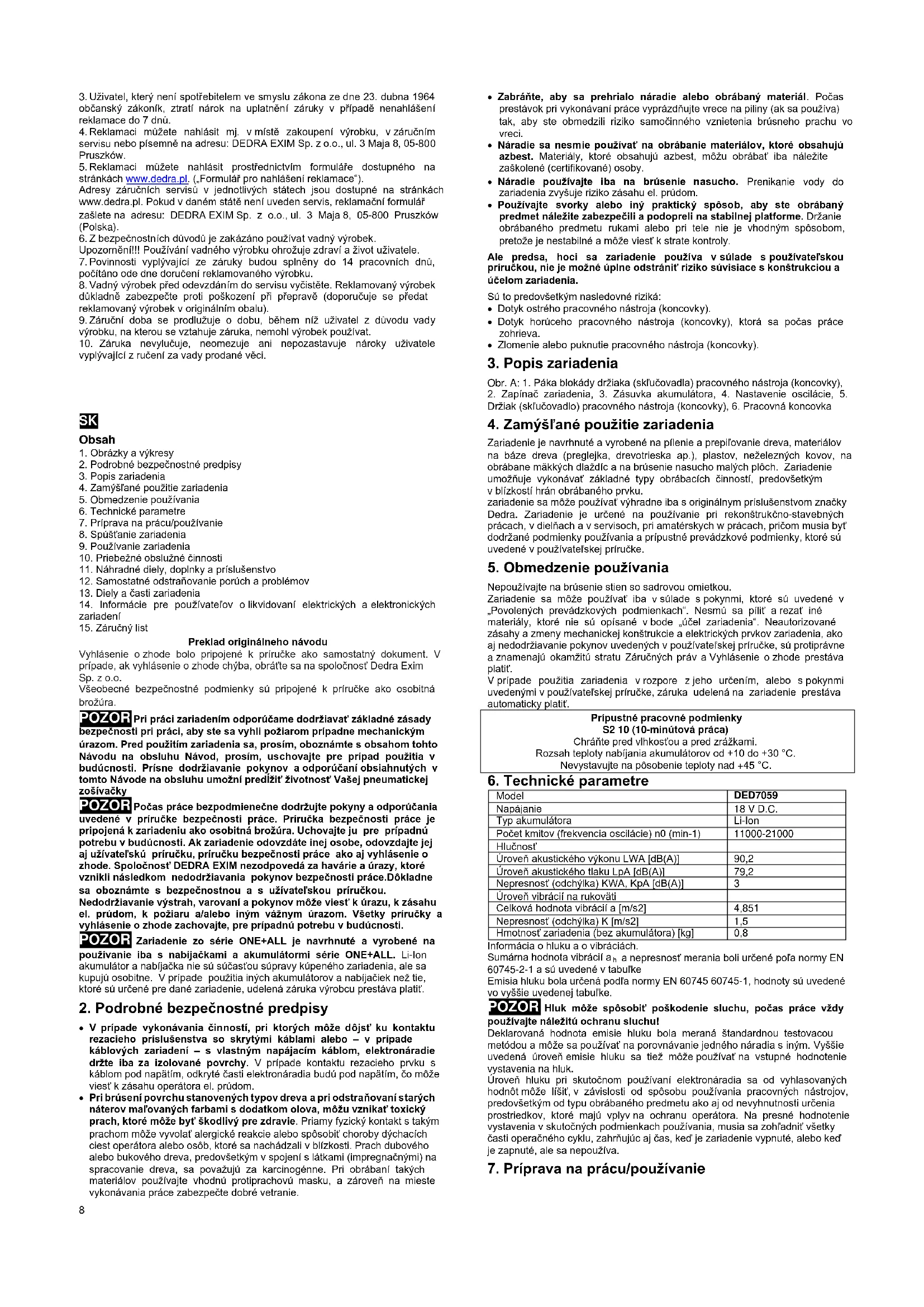 Zariadenie série ONE+ALL sa môže používať s každým akumulátorom série ONE+ALL. Aby ste si vybrali správny akumulátor a nabíjačku, odporúčame, aby ste sa oboznámili s ponukou Dedra Exim na webovej stránke www.dedra.pl. Keď chcete kúpiť náhradné diely alebo príslušenstvo, obráťte sa na servis Dedra Exim. Kontaktné údaje sú uvedené na 1. strane príručky. Pri objednávaní náhradných dielov vždy uveďte číslo šarže/série, ktoré je uvedené na výrobnom štítku, ako aj číslo dielu, ktoré je uvedené na schematickom nákrese zariadenia. Počas trvania záručnej lehoty sú prípadné opravy vykonávané podľa zásad uvedených v záručnom liste. Reklamovaný výrobok odovzdajte na opravu v mieste nákupu (predajca je povinný prijať reklamovaný výrobok), alebo ho zašlite do centrálneho servisu Dedra Exim alebo do servisu, ktorý je najbližšie pri mieste nákupu (zoznam servisov nájdete na webovom sídle www.dedra.pl). Pripojte vyplnený záručný list. Prosíme, nezabudnite na to. Po skončení záručnej lehoty opravy vykonáva centrálny servis. Poškodený výrobok pošlite do servisu (náklady na zásielku hradí užívateľ).