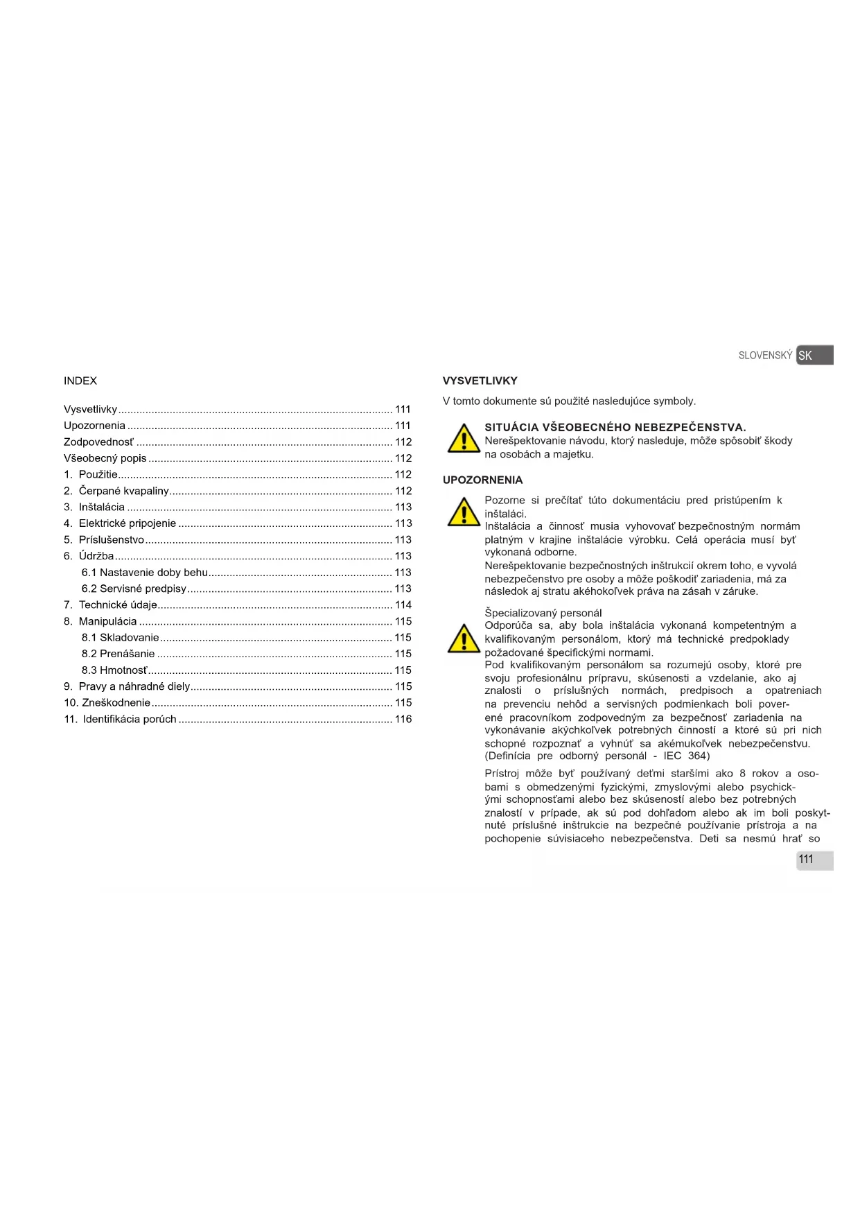 VYSVETLIVKY V tomto dokumente sú použité nasledujúce symboly. SITUÁCIA VŠEOBECNÉHO NEBEZPEČENSTVA. Nerešpektovanie návodu, ktorý nasleduje, môže spôsobiť škody na osobách a majetku. UPOZORNENIA Pozorne si prečítať túto dokumentáciu pred pristúpením k inštaláci. Inštalácia a činnosť musia vyhovovať bezpečnostným normám platným v krajine inštalácie výrobku. Celá operácia musí byť vykonaná odborne. Nerešpektovanie bezpečnostných inštrukcií okrem toho, e vyvolá nebezpečenstvo pre osoby a môže poškodiť zariadenia, má za následok aj stratu akéhokoľvek práva na zásah v záruke. Špecializovaný personál Odporúča sa, aby bola inštalácia vykonaná kompetentným a kvalikovaným personálom, ktorý má technické predpoklady požadované špecickými normami. Pod kvalikovaným personálom sa rozumejú osoby, ktoré pre svoju profesionálnu prípravu, skúsenosti a vzdelanie, ako aj znalosti o príslušných normách, predpisoch a opatreniach na prevenciu nehôd a servisných podmienkach boli pover- ené pracovníkom zodpovedným za bezpečnosť zariadenia na vykonávanie akýchkoľvek potrebných činností a ktoré sú pri nich schopné rozpoznať a vyhnúť sa akémukoľvek nebezpečenstvu. (Denícia pre odborný personál - IEC 364) Prístroj môže byť používaný deťmi staršími ako 8 rokov a oso- bami s obmedzenými fyzickými, zmyslovými alebo psychick- ými schopnosťami alebo bez skúseností alebo bez potrebných znalostí v prípade, ak sú pod dohľadom alebo ak im boli poskyt- nuté príslušné inštrukcie na bezpečné používanie prístroja a na pochopenie súvisiaceho nebezpečenstva. Deti sa nesmú hrať soSLOVENSKÝ