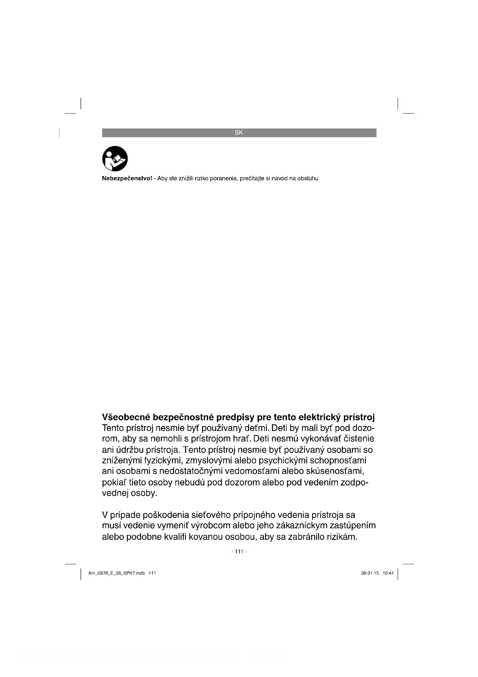 Nebezpečenstvo! - Aby ste znížili riziko poranenia, prečítajte si návod na obsluhu Všeobecné bezpečnostné predpisy pre tento elektrický prístroj Tento prístroj nesmie byť používaný deťmi. Deti by mali byť pod dozo- rom, aby sa nemohli s prístrojom hrať. Deti nesmú vykonávať čistenie ani údržbu prístroja. Tento prístroj nesmie byť používaný osobami so zníženými fyzickými, zmyslovými alebo psychickými schopnosťami ani osobami s nedostatočnými vedomosťami alebo skúsenosťami, pokiaľ tieto osoby nebudú pod dozorom alebo pod vedením zodpo- vednej osoby. V prípade poškodenia sieťového prípojného vedenia prístroja sa musí vedenie vymeniť výrobcom alebo jeho zákazníckym zastúpením alebo podobne kvalifi kovanou osobou, aby sa zabránilo rizikám. Anl_GEM_E_36_SPK7.indb 111Anl_GEM_E_36_SPK7.indb 111 30.01.15 10:4130.01.15 10:41SK