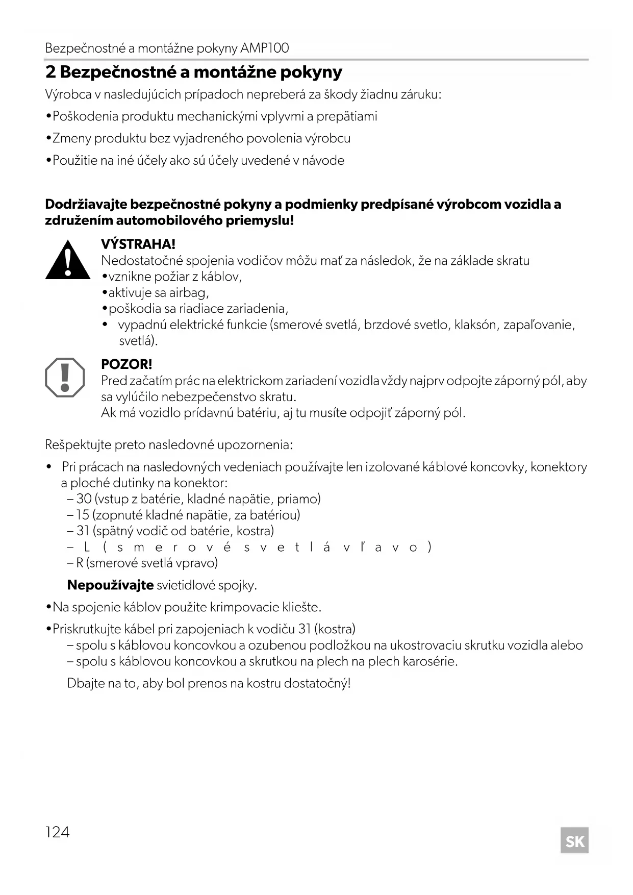 VÝSTRAHA! Bezpečnostný pokyn: Nerešpektovanie môže viest’ k smrti alebo k t’ažkému zraneniu. UPOZORNENIE! Bezpečnostný pokyn: Nerešpektovanie môže viest’ k zraneniam. POZOR! Nerešpektovanie môže viest’ k materiálnym škodám a môže ovplyvnit’ funkciu zariadenia. POZNÁMKA Doplňujúce informácie k obsluhe výrobku. AMP100-IO-16s.book Seite 123 Mittwoch, 26. Oktober 2016 11:15 11Bezpečnostné a montážne pokyny AMP100