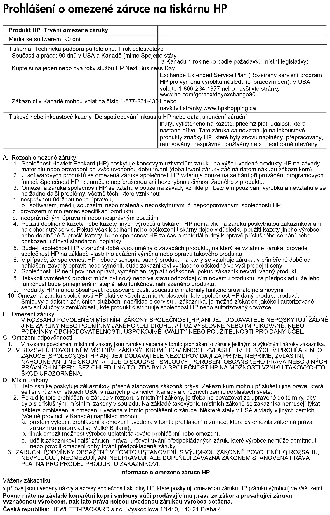 POVOLENÉHO ROZSAHU – NEVYLUČUJÚ, NEOBMEDZUJÚ ANI NEMENIA, ALE DOPĹŇAJÚ ZÁVÄZNÉ ZÁKONNÉ PRÁVA VZŤAHUJÚCE SA NA PREDAJ PRODUKTOV HP ZÁKAZNÍKOM. Informácia o obmedzenej záruke HP Vážený zákazník, v prílohe sú uvedené mená a adresy spoločností skupiny HP, ktoré zabezpečujú plnenia z obmedzenej záruky HP (záruka výrobcu) vo vašej krajine. Pokiaľ máte na základe vašej kúpnej zmluvy voči predávajúcemu práva zo zákona presahujúce záruku výrobcu, také práva nie sú uvedenou zárukou výrobcu dotknuté. Slovenská republika: Hewlett-Packard Slovakia, s.r.o., Galvaniho 7, 820 02 Bratislava Výrobok značky HP Trvanie obmedzenej záruky Médiá so softvérom 90 dní Tlačiareň Technická podpora po telefonu: 1 rok celosvětově Součásti a práce: 90 dnů v USA a Kanadě (mimo Spojené státy a Kanadu 1 rok nebo podle požadavků místní legislativy) Zakúpte si jedno- alebo dvojročnú rozšírenú záruku spoločnosti HP s výmenou do nasledujúceho pracovného dňa. V USA zatelefonujte na číslo 1 866 234 1377 alebo navštívte adresu www.hp.com/go/nextdayexchange90. Ak ste kanadskí zákazníci, zatelefonujú na číslo 1 877 231 4351 alebo navštívte adresu www.hpshopping.ca. Tlačové alebo atramentové kazety Do spotrebovania atramentu HP alebo dátumu „skončenia záručnej lehoty“ vytlačeného na kazete, pričom plať skoršia z týchto udalosť. Táto záruka sa nevzťahuje na atramentové produkty značky HP, ktoré boli opätovne naplnené, prerobené, renovované, nesprávne používané alebo neodborne otvorené.