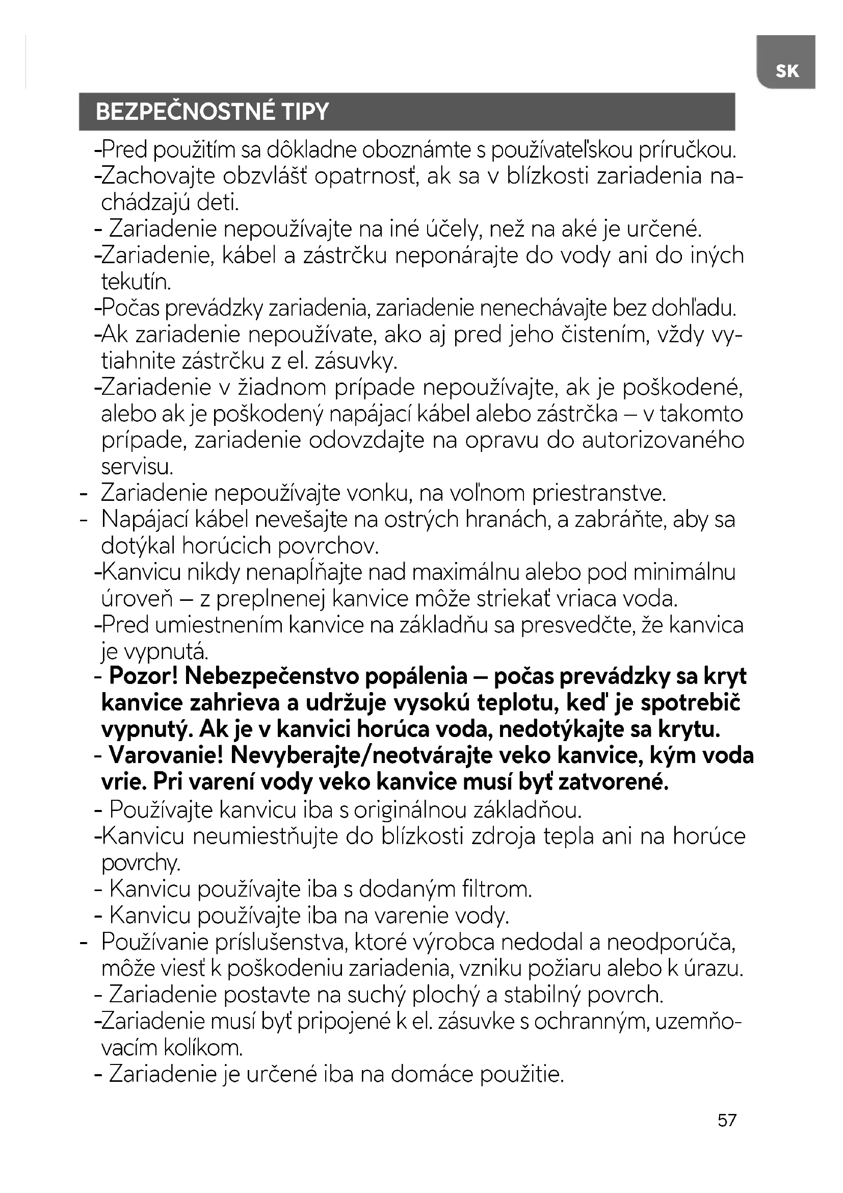 Kanvicu neumiestňujte do blízkosti zdroja tepla ani na horúce povrchy. - Kanvicu používajte iba s dodaným filtrom. - Kanvicu používajte iba na varenie vody. - Používanie príslušenstva, ktoré výrobca nedodal a neodporúča, môže viesť k poškodeniu zariadenia, vzniku požiaru alebo k úrazu. - Zariadenie postavte na suchý plochý a stabilný povrch.