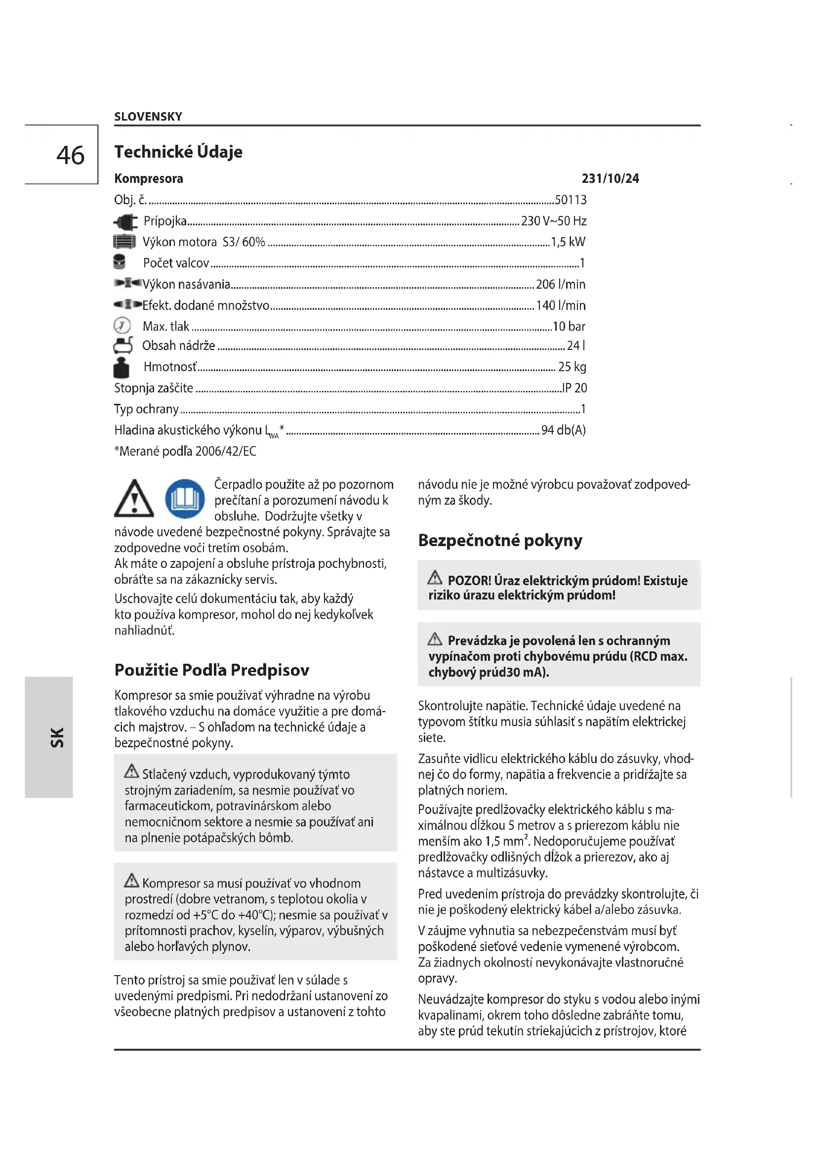 ximálnou dĺžkou 5 metrov a s prierezom káblu nie menším ako 1,5 mm². Nedoporučujeme používať predlžovačky odlišných dĺžok a prierezov, ako aj nástavce a multizásuvky. Pred uvedením prístroja do prevádzky skontrolujte, či nie je poškodený elektrický kábel a/alebo zásuvka. V záujme vyhnutia sa nebezpečenstvám musí byť poškodené sieťové vedenie vymenené výrobcom. Za žiadnych okolností nevykonávajte vlastnoručné opravy. Neuvádzajte kompresor do styku s vodou alebo inými kvapalinami, okrem toho dôsledne zabráňte tomu, aby ste prúd tekutín striekajúcich z prístrojov, ktoré Technické Údaje Kompresora 231/10/24 SK47