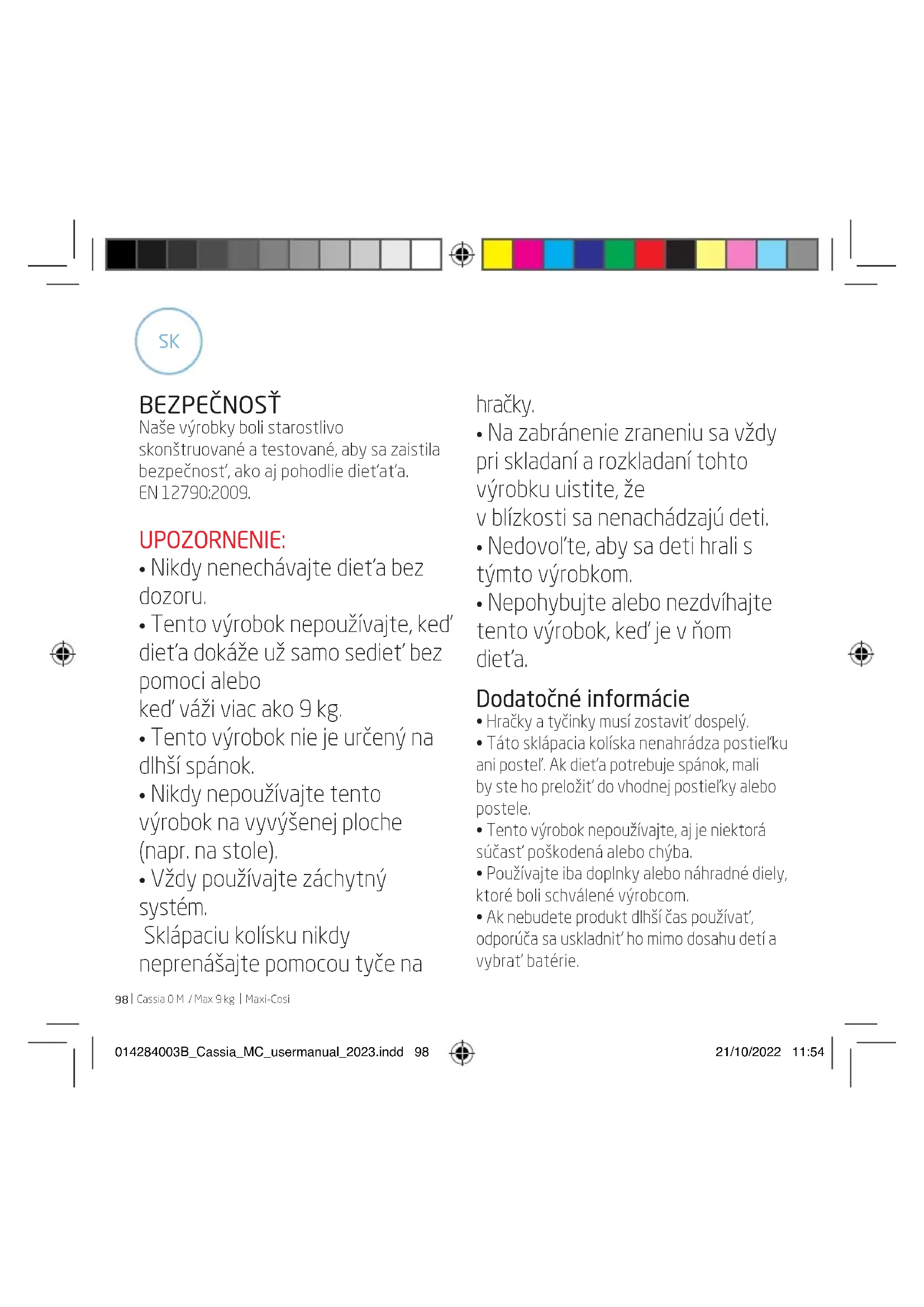 Maxi-Cosi Záruka Naša 24 mesačná záruka je prejavom nášho presvedčenia o najvyššej kvalite nášho dizajnu, inžinierstva, výroby a výkonu produktu. Ručíme za to, že tento produkt bol vyrobený v súlade so súčasnými Európskymi požiadavkami na bezpečnosť a štandardami kvality, ktoré sa vzťahujú na tento produkt a že v čase kúpy tento produkt neobsahuje chyby v materiáloch a v prevedení. Za podmienok uvedených v tomto dokumente sa spotrebitelia môžu dovolávať tejto záruky v krajinách, kde bol tento výrobok predávaný dcérskou spoločnosťou skupiny Dorel, autorizovaným dílerom alebo predajcom. Naša 24 mesačná záruka pokrýva akékoľvek výrobné chyby v materiáloch a v prevedení, ak sa produkt používa pri normálnych podmienkach a v súlade s našim návodom na používanie po dobu 24 mesiacov od dátumu pôvodného maloobchodného nákupu prvým koncovým zákazníkom. Pri žiadosti o opravy alebo náhrady súčiastok na základe záruky pri chybách v materiáloch a v prevedení musíte mať doklad o kúpe vykonanej v rámci 24 mesiacov pred žiadosťou o opravu. Naša 24 mesačná záruka sa nevzťahuje na chyby spôsobené bežným opotrebením, škody spôsobené nehodami, zneužitím, nedbalosťou, požiarom, kontaktom s kvapalinou či inými vonkajšími príčinami, škody, ktoré sú dôsledkom nedodržania užívateľskej príručky, poškodenia spôsobené použitím s iným produktom, škody spôsobené opravami, ktoré nepovoľujeme, alebo v prípade, že je výrobok odcudzený alebo ak bolo odstránené, alebo zmenené označenie alebo identifikačné číslo z výrobku. Príklady bežného opotrebenia sú kolesá a textílie opotrebované pri pravidelnom používaní a prirodzené členenie farieb a materiálov, z dôvodu normálneho starnutia výrobku. Čo robiť v prípade chýb: Ak nastanú problémy alebo chyby, vašou