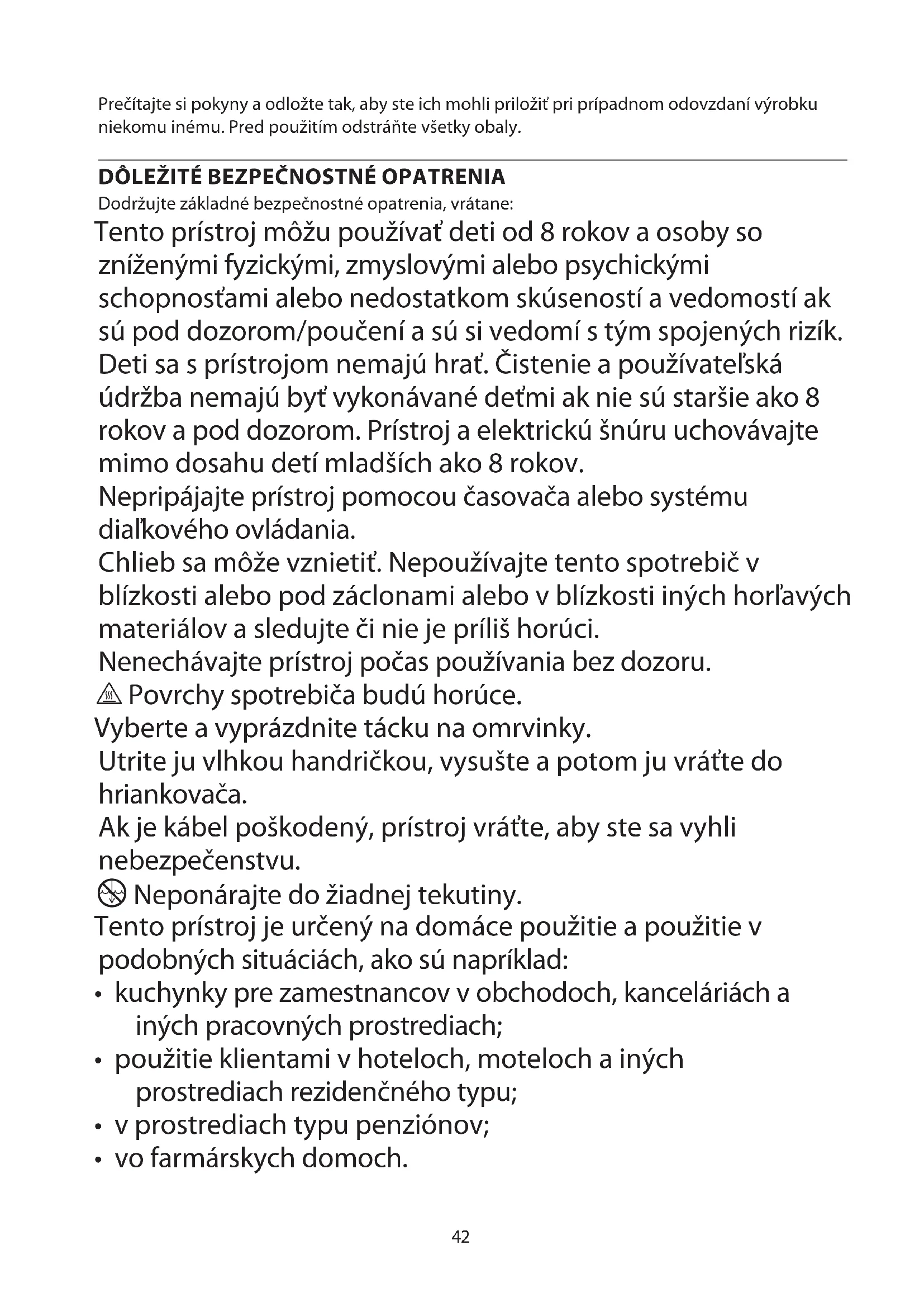 Dodržujte základné bezpečnostné opatrenia, vrátane: Tento prístroj môžu používať deti od 8 rokov a osoby so zníženými fyzickými, zmyslovými alebo psychickými schopnosťami alebo nedostatkom skúseností a vedomostí ak sú pod dozorom/poučení a sú si vedomí s tým spojených rizík. Deti sa s prístrojom nemajú hrať. Čistenie a používateľská údržba nemajú byť vykonávané deťmi ak nie sú staršie ako 8 rokov a pod dozorom. Prístroj a elektrickú šnúru uchovávajte mimo dosahu detí mladších ako 8 rokov. Nepripájajte prístroj pomocou časovača alebo systému diaľkového ovládania. Chlieb sa môže vznietiť. Nepoužívajte tento spotrebič v blízkosti alebo pod záclonami alebo v blízkosti iných horľavých materiálov a sledujte či nie je príliš horúci. Nenechávajte prístroj počas používania bez dozoru. h Povrchy spotrebiča budú horúce. Vyberte a vyprázdnite tácku na omrvinky. Utrite ju vlhkou handričkou, vysušte a potom ju vráťte do hriankovača. Ak je kábel poškodený, prístroj vráťte, aby ste sa vyhli nebezpečenstvu. i Neponárajte do žiadnej tekutiny. Tento prístroj je určený na domáce použitie a použitie v podobných situáciách, ako sú napríklad: