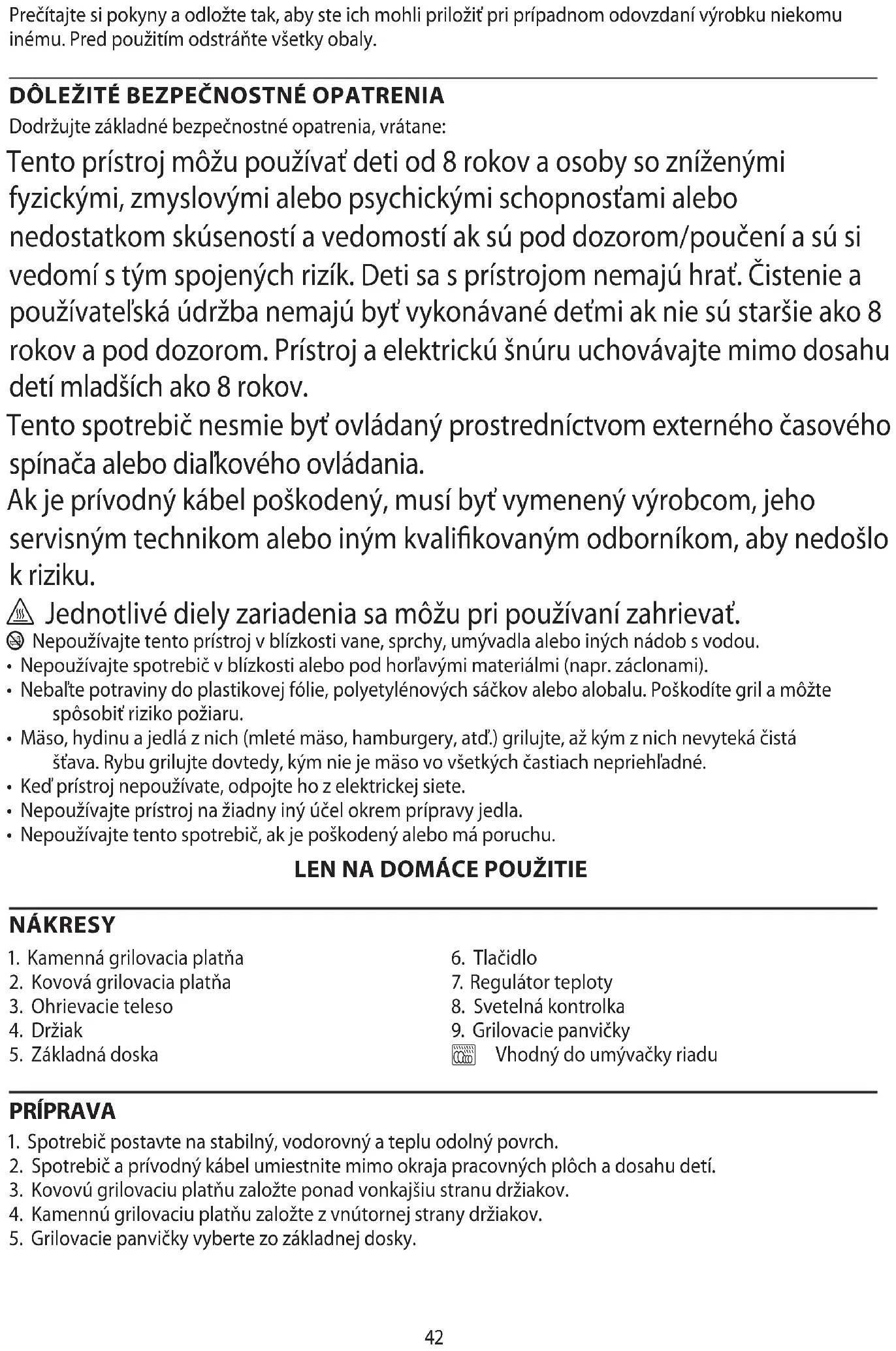 Dodržujte základné bezpečnostné opatrenia, vrátane: Tento prístroj môžu používať deti od 8 rokov a osoby so zníženými fyzickými, zmyslovými alebo psychickými schopnosťami alebo nedostatkom skúseností a vedomostí ak sú pod dozorom/poučení a sú si vedomí s tým spojených rizík. Deti sa s prístrojom nemajú hrať. Čistenie a používateľská údržba nemajú byť vykonávané deťmi ak nie sú staršie ako 8 rokov a pod dozorom. Prístroj a elektrickú šnúru uchovávajte mimo dosahu detí mladších ako 8 rokov. Tento spotrebič nesmie byť ovládaný prostredníctvom externého časového spínača alebo diaľkového ovládania. Ak je prívodný kábel poškodený, musí byť vymenený výrobcom, jeho servisným technikom alebo iným kvalifikovaným odborníkom, aby nedošlo k riziku.