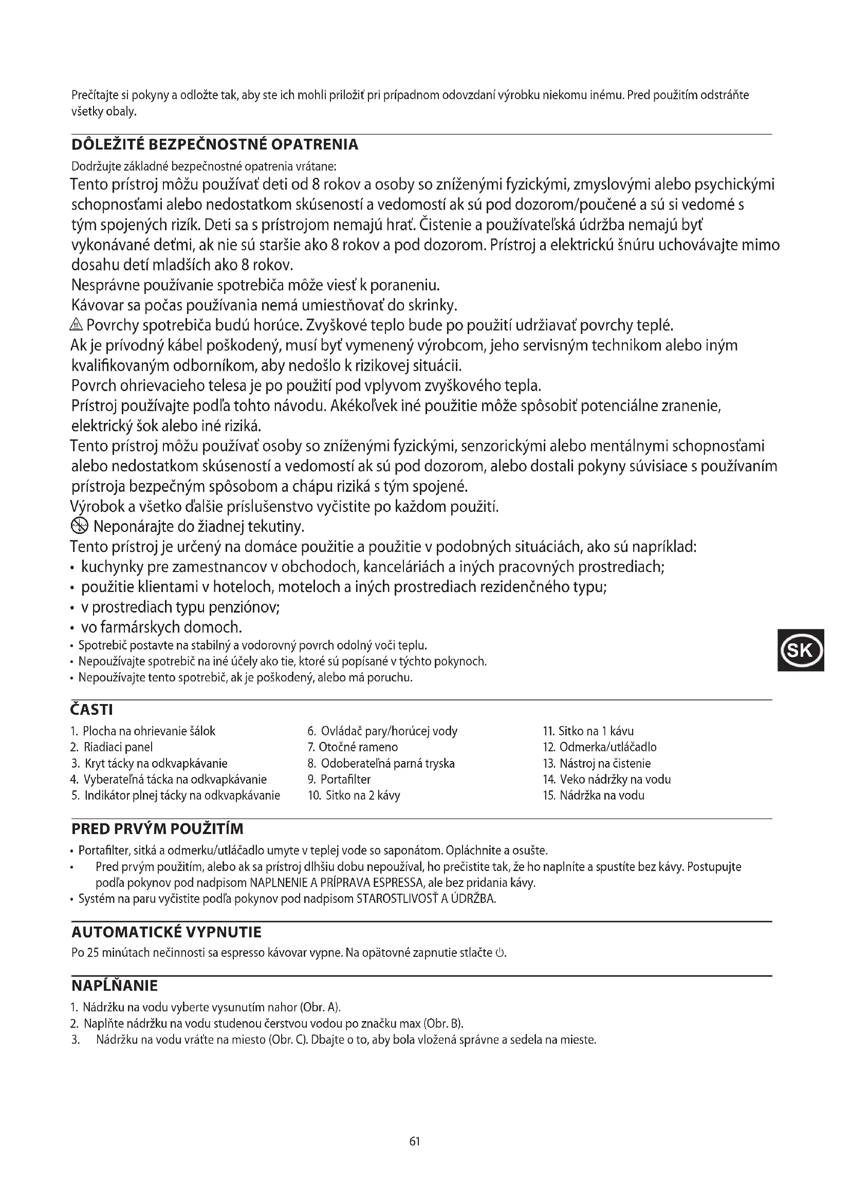 Dodržujte základné bezpečnostné opatrenia vrátane: Tento prístroj môžu používať deti od 8 rokov a osoby so zníženými fyzickými, zmyslovými alebo psychickými schopnosťami alebo nedostatkom skúseností a vedomostí ak sú pod dozorom/poučené a sú si vedomé s tým spojených rizík. Deti sa s prístrojom nemajú hrať. Čistenie a používateľská údržba nemajú byť vykonávané deťmi, ak nie sú staršie ako 8 rokov a pod dozorom. Prístroj a elektrickú šnúru uchovávajte mimo dosahu detí mladších ako 8 rokov. Nesprávne používanie spotrebiča môže viesť k poraneniu. Kávovar sa počas používania nemá umiestňovať do skrinky. h Povrchy spotrebiča budú horúce. Zvyškové teplo bude po použití udržiavať povrchy teplé. Ak je prívodný kábel poškodený, musí byť vymenený výrobcom, jeho servisným technikom alebo iným kvalifikovaným odborníkom, aby nedošlo k rizikovej situácii. Povrch ohrievacieho telesa je po použití pod vplyvom zvyškového tepla. Prístroj používajte podľa tohto návodu. Akékoľvek iné použitie môže spôsobiť potenciálne zranenie, elektrický šok alebo iné riziká. Tento prístroj môžu používať osoby so zníženými fyzickými, senzorickými alebo mentálnymi schopnosťami alebo nedostatkom skúseností a vedomostí ak sú pod dozorom, alebo dostali pokyny súvisiace s používaním prístroja bezpečným spôsobom a chápu riziká s tým spojené. Výrobok a všetko ďalšie príslušenstvo vyčistite po každom použití.