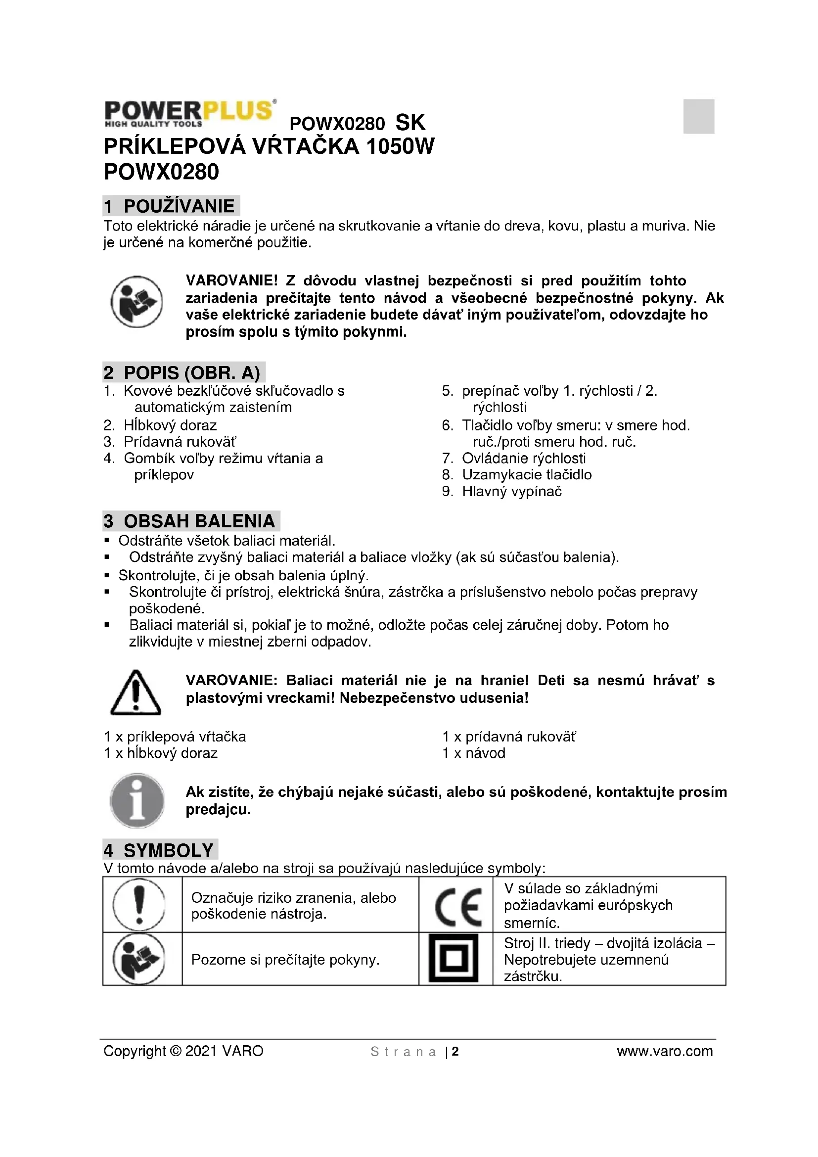 - Značka „2“ je poloha vysokej rýchlosti. Vŕtačka má dvojrýchlostné prevodové súkolesie určené na vŕtanie pri rýchlosti (1) alebo (2). Volič rýchlosti je umiestnený na ľavej strane vŕtačky a možno ním zvoliť buď nízku alebo vysokú rýchlosť. Keď zvolíte nízky rýchlostný stupeň, rýchlosť sa zníži, ale bude dodávať viac sily a uťahovacieho momentu. Keď vŕtačku používate pri vysokom rýchlostnom stupni, rýchlosť saPOWX0280 SK Copyright © 2021 VARO S t r a n a | 6 www.varo.com zvýši, ale bude poskytovať nižší výkon a uťahovací moment. Nižšiu rýchlosť používajte na použitie väčšej sily a uťahovacieho momentu a vyššiu rýchlosť používajte na rýchle vŕtanie. Tento dvojrýchlostný regulátor (5) nenastavujte NIKDY, keď vŕtačka beží. Najprv počkajte, kým sa úplne nezastaví.