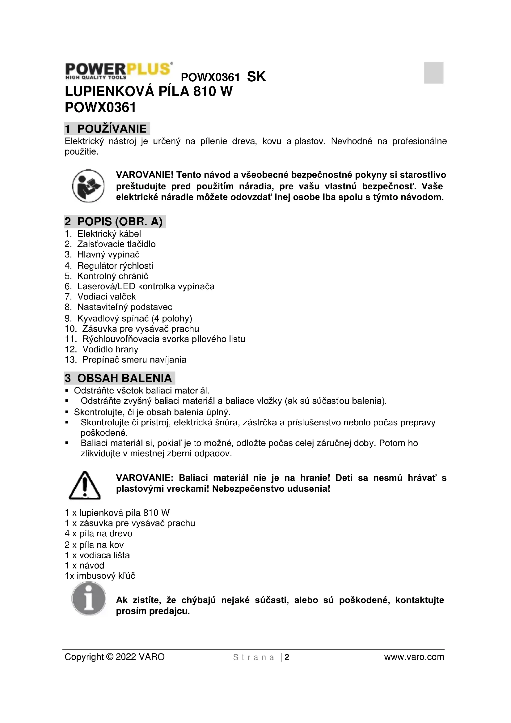 - Elektrické náradie, doplnky a nástrojové koncovky a pod. používajte v súlade s týmito pokynmi a spôsobom, zamýšľaným pre daný druh elektrického náradia, berúc na zreteľ pracovné podmienky a na prácu, ktorá sa má vykonávať. Používanie elektrického náradia na iné operácie ako tie, pre ktoré je určené, môže spôsobiť nebezpečnú situáciu.POWX0361 SK Copyright © 2022 VARO S t r a n a | 5 www.varo.com