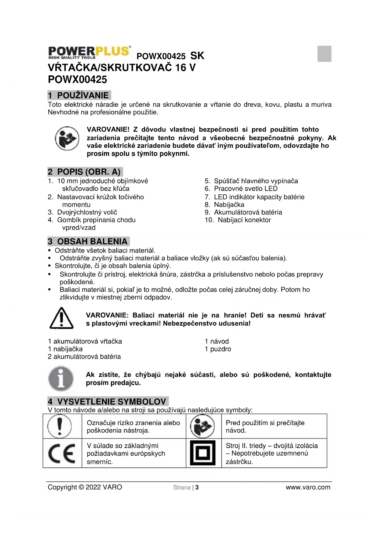 VARO N.V. - Vic. Van Rompuy N.V.- Joseph Van Instraat 9 - BE2500 Lier - BELGICKO vyhlasuje, že výrobok: Vŕtačka/Skrutkovač obchodná známka: POWERplus model: POWX00425 je v súlade so základnými požiadavkami a inými relevantnými ustanoveniami príslušných európskych smerníc, na základe uplatnenia európskych harmonizovaných noriem. V prípade akýchkoľvek neoprávnených úprav tohto zariadenia stráca toto vyhlásenie svoju platnosť. Európske smernice (vrátane ich prípadných novelizácií do dátumu podpisu): 2014/30/EÚ 2006/42/ES 2011/65/EÚ Európske harmonizované normy (vrátane ich prípadných novelizácií do dátumu podpisu): EN62841-1 : 2015 EN62841-2-1 : 2018 EN55014-1 : 2017 EN55014-2 : 2015 Uchovávateľ technickej dokumentácie: Philippe Vankerkhove, VARO – Vic. Van Rompuy N.V. Dolu podpísaný koná v mene výkonného riaditeľa spoločnosti, Ludo Mertens Regulačné záležitosti – Compliance Manager 22/12/2021, Lier - BelgiumPOWX00425 RO Copyright © 2022 VARO P a g i n a | 1 www.varo.com