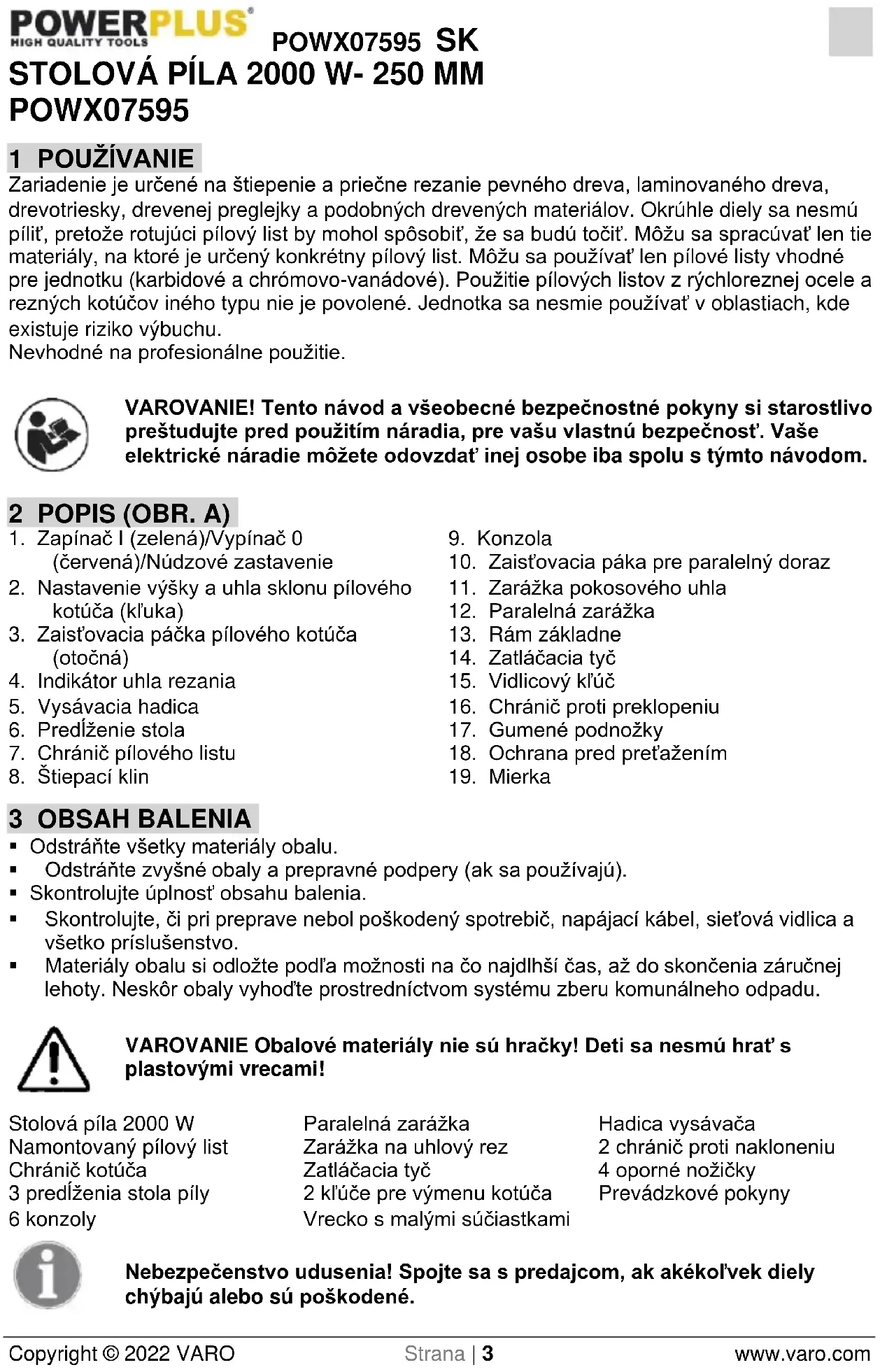 - Materiály obalu si odložte podľa možnosti na čo najdlhší čas, až do skončenia záručnej lehoty. Neskôr obaly vyhoďte prostredníctvom systému zberu komunálneho odpadu. VAROVANIE Obalové materiály nie sú hračky! Deti sa nesmú hrať s plastovými vrecami! Stolová píla 2000 W Namontovaný pílový list Chránič kotúča 3 predĺženia stola píly 6 konzoly Paralelná zarážka Zarážka na uhlový rez Zatláčacia tyč 2 kľúče pre výmenu kotúča Vrecko s malými súčiastkami Hadica vysávača 2 chránič proti nakloneniu 4 oporné nožičky Prevádzkové pokyny Nebezpečenstvo udusenia! Spojte sa s predajcom, ak akékoľvek diely chýbajú alebo sú poškodené.POWX07595 SK Copyright © 2022 VARO Strana | 4 www.varo.com