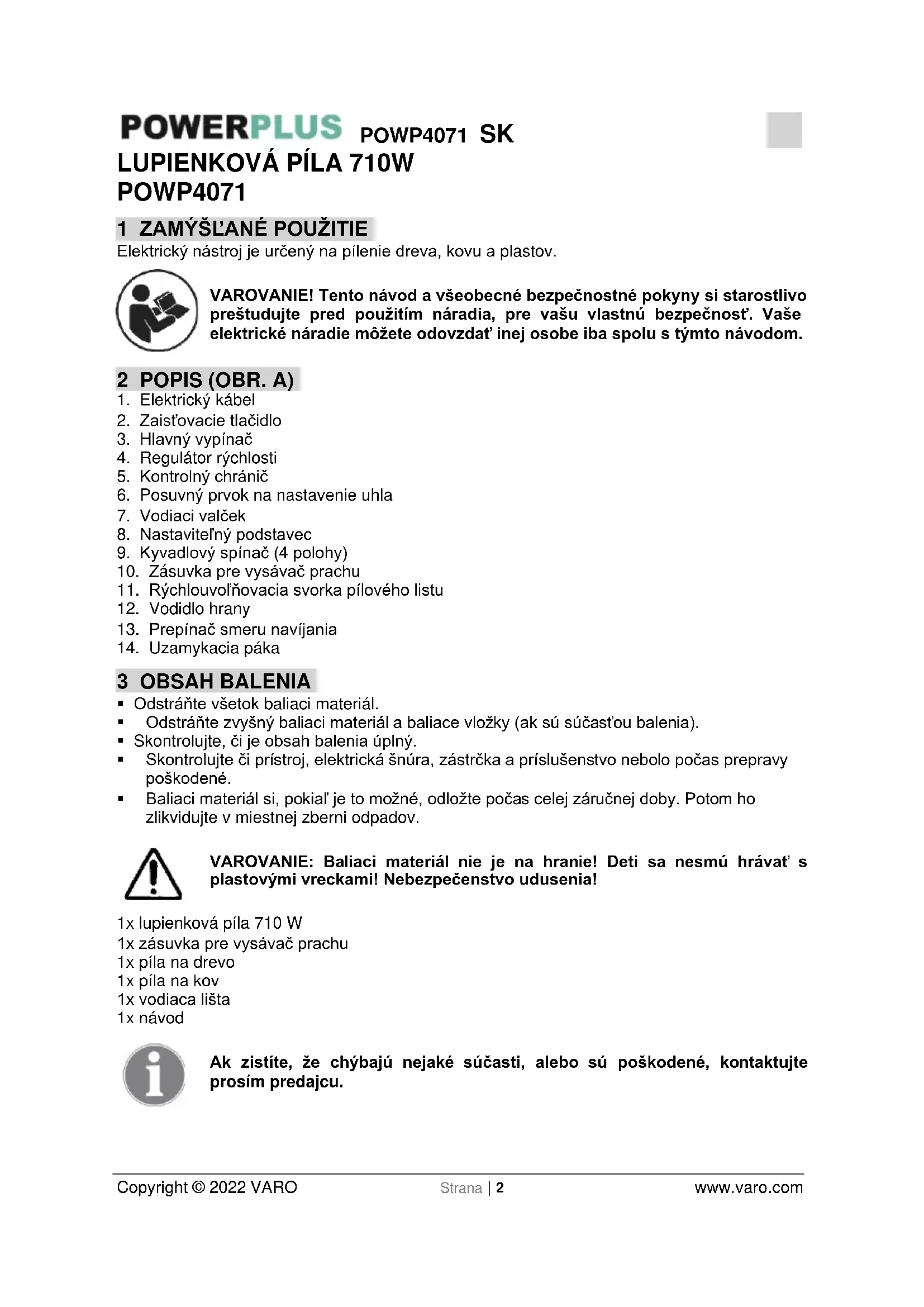- Baliaci materiál si, pokiaľ je to možné, odložte počas celej záručnej doby. Potom ho zlikvidujte v miestnej zberni odpadov. VAROVANIE: Baliaci materiál nie je na hranie! Deti sa nesmú hrávať s plastovými vreckami! Nebezpečenstvo udusenia! 1x lupienková píla 710 W 1x zásuvka pre vysávač prachu 1x píla na drevo 1x píla na kov 1x vodiaca lišta 1x návod Ak zistíte, že chýbajú nejaké súčasti, alebo sú poškodené, kontaktujte prosím predajcu.POWP4071 SK Copyright © 2022 VARO Strana | 3 www.varo.com 4 SYMBOLY V tomto návode a/alebo na stroji sa používajú nasledujúce symboly: