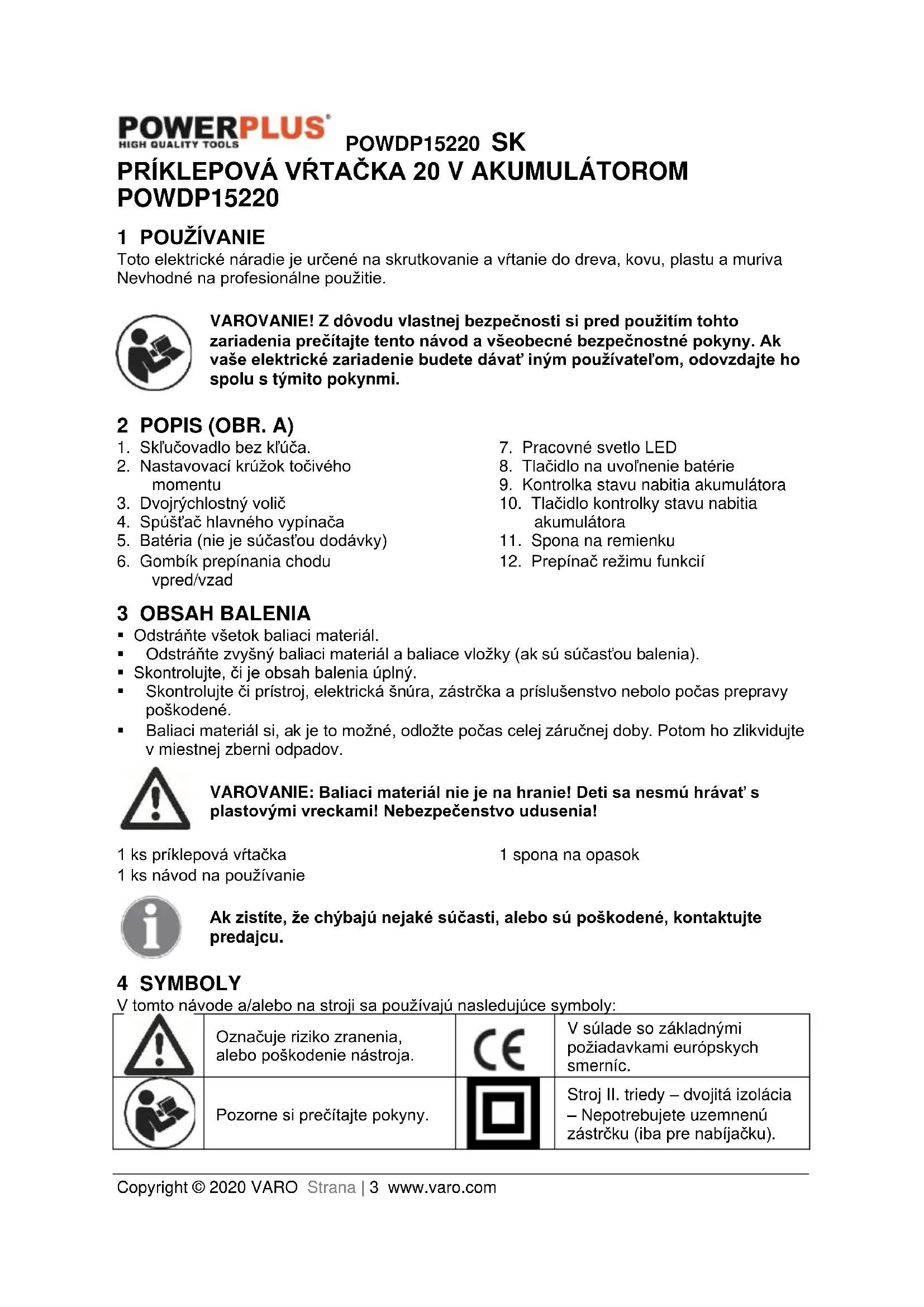 - Vyhýbajte sa náhodnému spusteniu nástroja. Pripravte sa začať pracovať pred zapnutím nástroja.POWDP15220 SK Copyright © 2020 VARO Strana | 6 www.varo.com