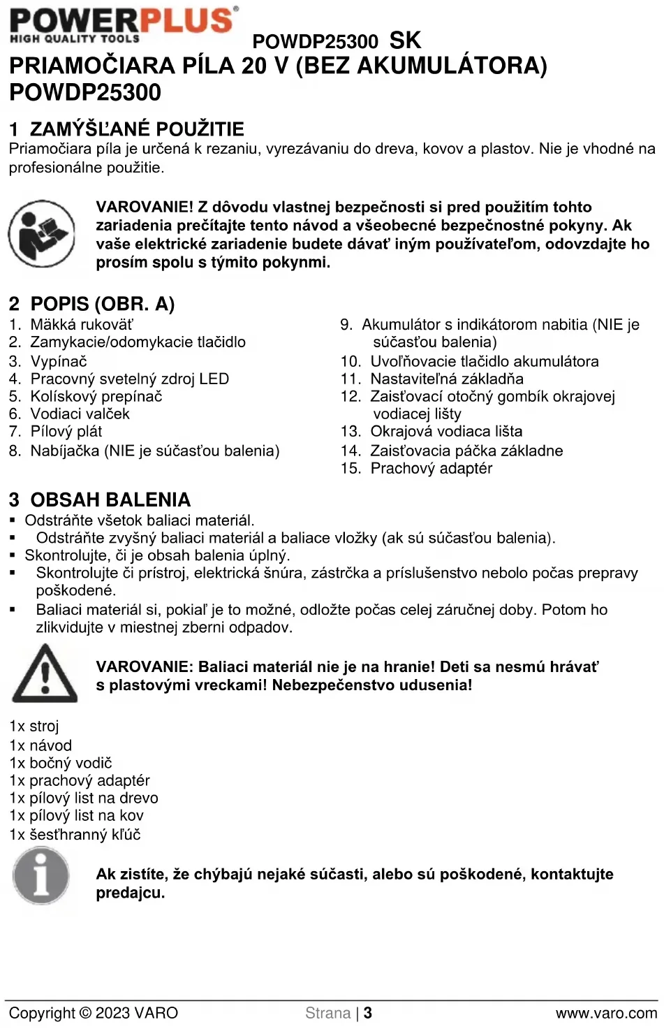 - Po vypnutí píly bude pílový list krátky čas v chode.POWDP25300 SK Copyright © 2023 VARO Strana | 7 www.varo.com