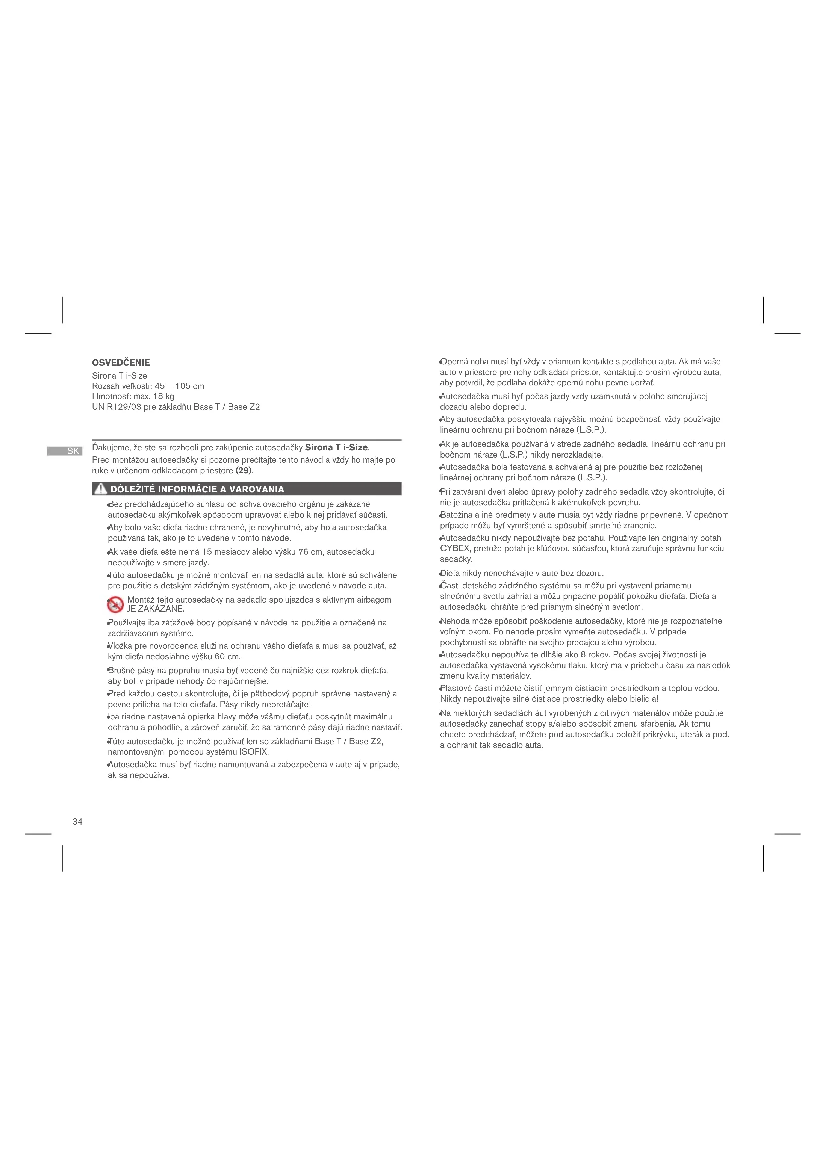 Toto je detský zádržný systém i-Size. Vyhovuje nariadeniu UN č. R129/03 pre základňu Base T / Base Z2, pre použitie vo vozidlách kompatibilných s polohovacím systémom i-Size, ako je uvedené výrobcom vozidla v používateľskom návode pre vozidlo. Ak vaše vozidlo nemá polohovací systém i-Size, skontrolujte prosím zoznam vozidiel. Najnovšiu verziu zoznamu vozidiel môžete nájsť na www.cybex-online.com.