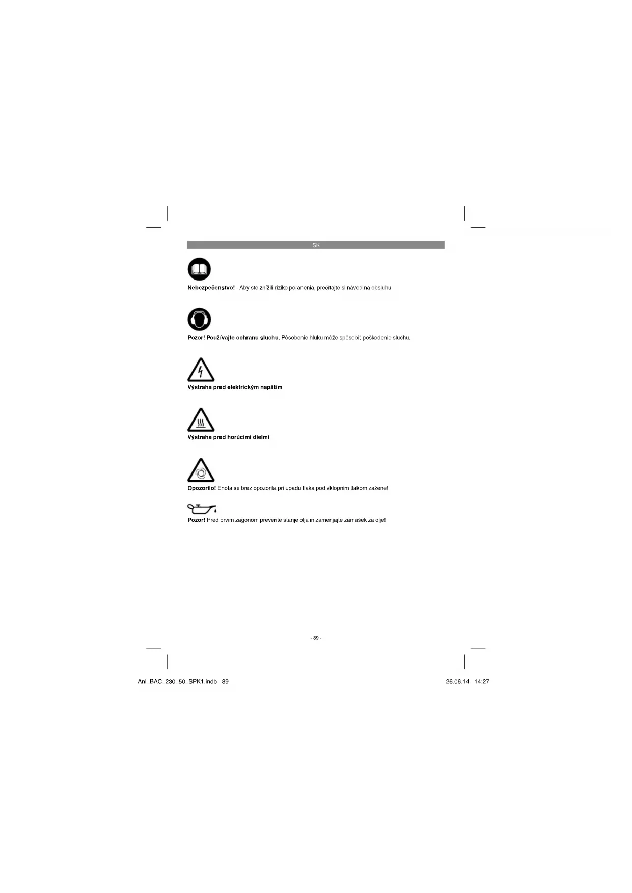 Pozor! Používajte ochranu sluchu. Pôsobenie hluku môže spôsobiť poškodenie sluchu. Nebezpečenstvo! - Aby ste znížili riziko poranenia, prečítajte si návod na obsluhu Výstraha pred elektrickým napätím Výstraha pred horúcimi dielmi Opozorilo! Enota se brez opozorila pri upadu tlaka pod vklopnim tlakom zažene! Pozor! Pred prvim zagonom preverite stanje olja in zamenjajte zamašek za olje! Anl_BAC_230_50_SPK1.indb 89Anl_BAC_230_50_SPK1.indb 89 26.06.14 14:2726.06.14 14:27SK