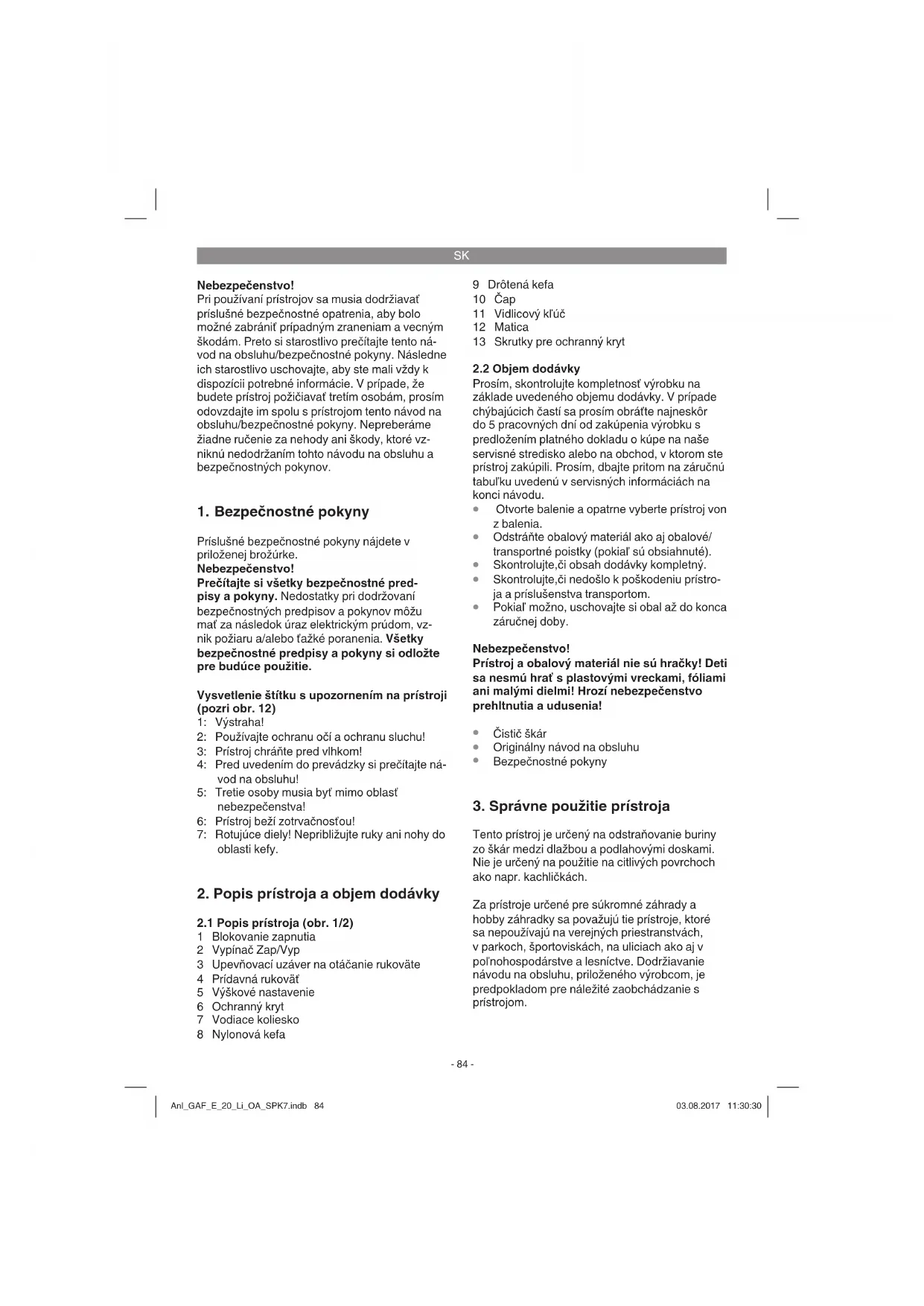 Tento prístroj je určený na odstraňovanie buriny zo škár medzi dlažbou a podlahovými doskami. Nie je určený na použitie na citlivých povrchoch ako napr. kachličkách. Za prístroje určené pre súkromné záhrady a hobby záhradky sa považujú tie prístroje, ktoré sa nepoužívajú na verejných priestranstvách, v parkoch, športoviskách, na uliciach ako aj v poľnohospodárstve a lesníctve. Dodržiavanie návodu na obsluhu, priloženého výrobcom, je predpokladom pre náležité zaobchádzanie s prístrojom. Anl_GAF_E_20_Li_OA_SPK7.indb 84Anl_GAF_E_20_Li_OA_SPK7.indb 84 03.08.2017 11:30:3003.08.2017 11:30:30SK