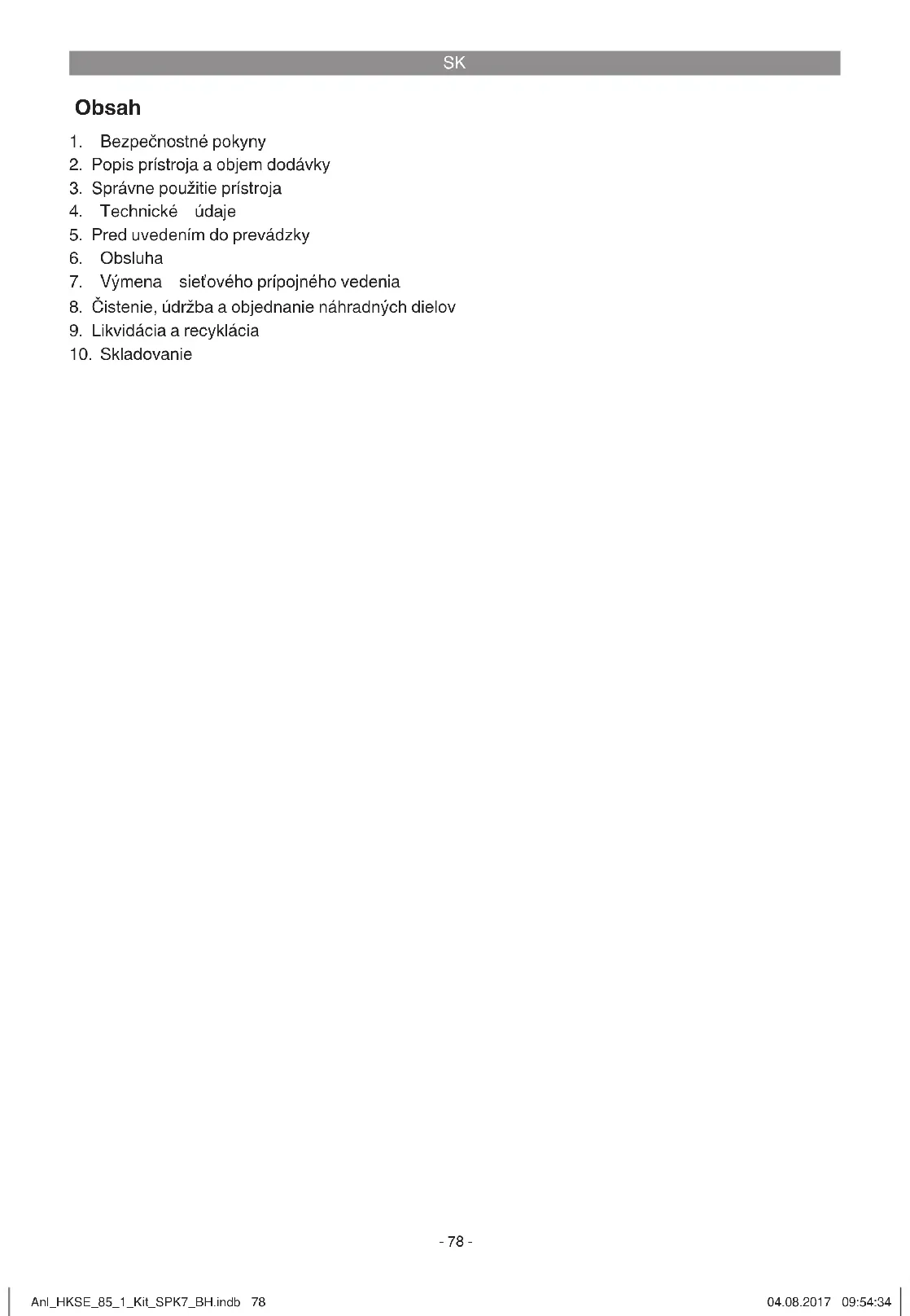 vedenia Nebezpečenstvo! V prípade poškodenia sieťového prípojného vedenia prístroja sa musí vedenie vymeniť výrob- com alebo jeho zákazníckym zastúpením alebo podobne kvalifi kovanou osobou, aby sa zabránilo rizikám. Anl_HKSE_85_1_Kit_SPK7_BH.indb 82Anl_HKSE_85_1_Kit_SPK7_BH.indb 82 04.08.2017 09:54:3504.08.2017 09:54:35SK