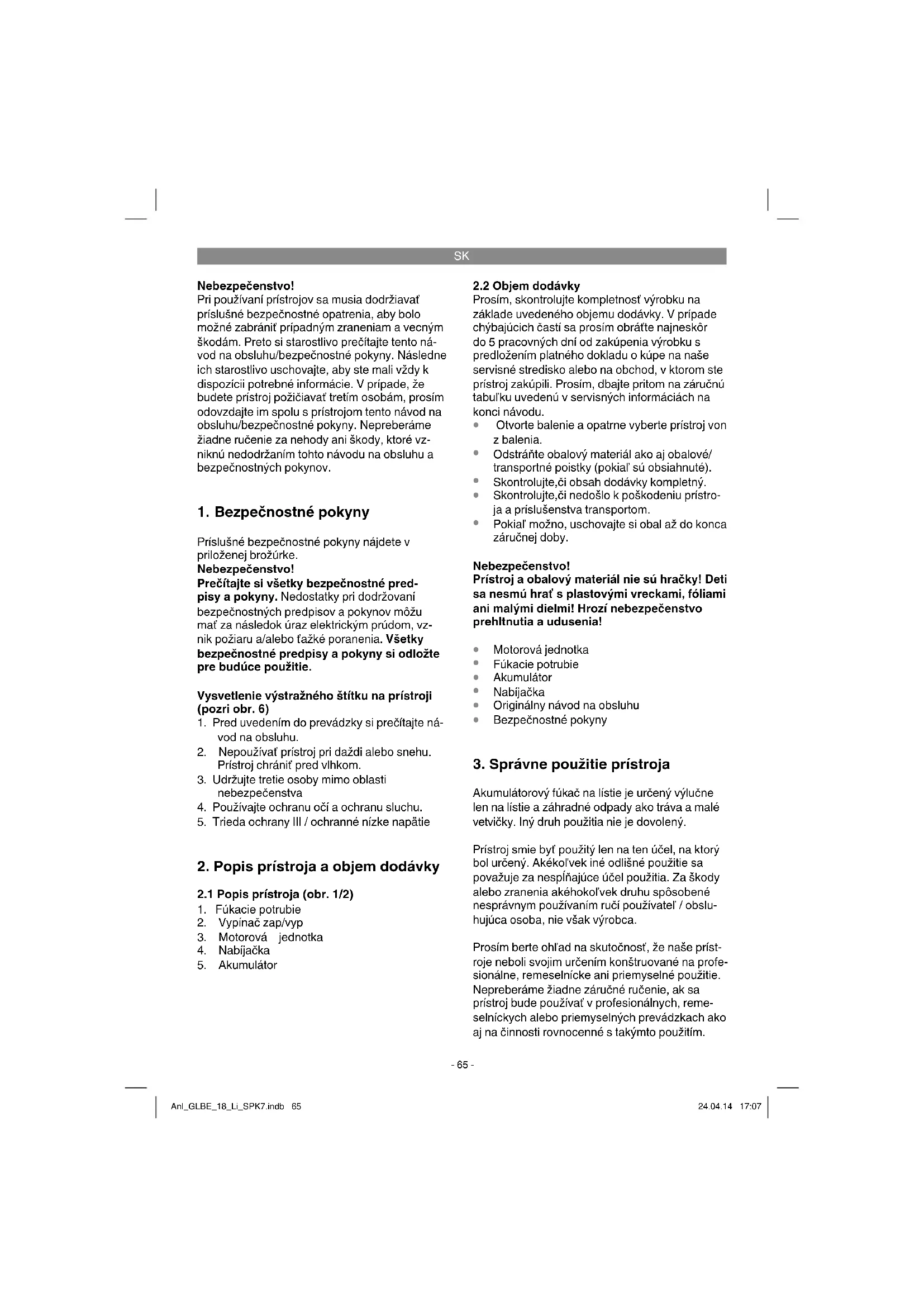 Akumulátorový fúkač na lístie je určený výlučne len na lístie a záhradné odpady ako tráva a malé vetvičky. Iný druh použitia nie je dovolený. Prístroj smie byť použitý len na ten účel, na ktorý bol určený. Akékoľvek iné odlišné použitie sa považuje za nespĺňajúce účel použitia. Za škody alebo zranenia akéhokoľvek druhu spôsobené nesprávnym používaním ručí používateľ / obslu- hujúca osoba, nie však výrobca. Prosím berte ohľad na skutočnosť, že naše príst- roje neboli svojim určením konštruované na profe- sionálne, remeselnícke ani priemyselné použitie. Nepreberáme žiadne záručné ručenie, ak sa prístroj bude používať v profesionálnych, reme- selníckych alebo priemyselných prevádzkach ako aj na činnosti rovnocenné s takýmto použitím. Anl_GLBE_18_Li_SPK7.indb 65Anl_GLBE_18_Li_SPK7.indb 65 24.04.14 17:0724.04.14 17:07SK