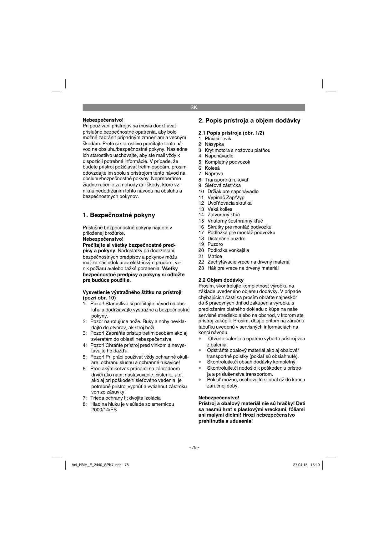 Pokiaľ možno, uschovajte si obal až do konca záručnej doby. Nebezpečenstvo! Prístroj a obalový materiál nie sú hračky! Deti sa nesmú hrať s plastovými vreckami, fóliami ani malými dielmi! Hrozí nebezpečenstvo prehltnutia a udusenia! Anl_HMH_E_2440_SPK7.indb 78Anl_HMH_E_2440_SPK7.indb 78 27.04.15 15:1927.04.15 15:19SK