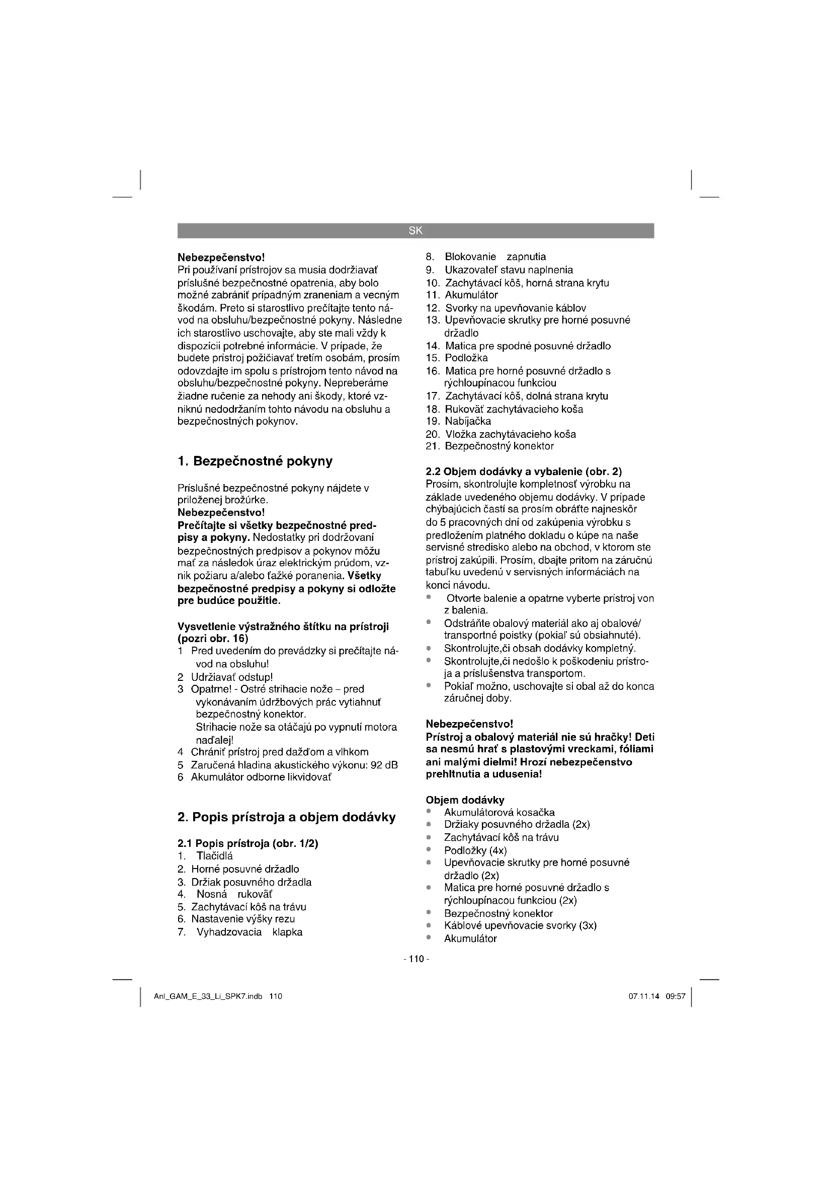 Opatrne! Kosačka je vybavená bezpečnostným spínaním, aby sa zabránilo neoprávnenému používaniu. Bezprostredne pred uvedením kosačky do pre- vádzky vložiť bezpečnostný konektor (obr. 13)a pri každom prerušení alebo ukončení práce znovu bezpečnostný konektor odstrániť. Pozor! Aby ste zabránili samovoľnému zapnutiu prístroja, je kosačka vybavená blokovaním zapnutia (obr. 4/pol. 8), ktoré musí byť stlačené pred tým, než je možné stlačiť spínacie tlačidlá (obr. 4/pol. 1). Keď sa spínacie tlačidlá pustia, tak sa kosačka automaticky vypne. Vyskúšajte tento proces vypí- nania niekoľkokrát, aby ste sa presvedčili, že Váš prístroj funguje správne. Pred tým, než budete na prístroji vykonávať opravy alebo údržbové práce, musíte sa presvedčiť o tom, že sa nôž netočí a že bol vytiahnutý bezpečnostný konektor. Výstraha! V žiadnom prípade neotvárajte vyhadzovaciu klapku počas vyprázdňovania zachytávacieho ústrojenstva a pokiaľ motor beží. Rotujúci nôž môže viesť k zraneniam. Vyhadzovaciu klapku resp. zachytávací kôš na trávu vždy starostlivo upevnite. Pri odstraňovaní je potrebné vypnúť motor. Bezpečnostný odstup medzi krytom noža a obsluhujúcou osobou determinovaný vodiacim držadlom sa musí vždy dodržiavať. Pri kosení a zmene smeru pohybu na svahoch a plochách Anl_GAM_E_33_Li_SPK7.indb 113Anl_GAM_E_33_Li_SPK7.indb 113 07.11.14 09:5707.11.14 09:57SK