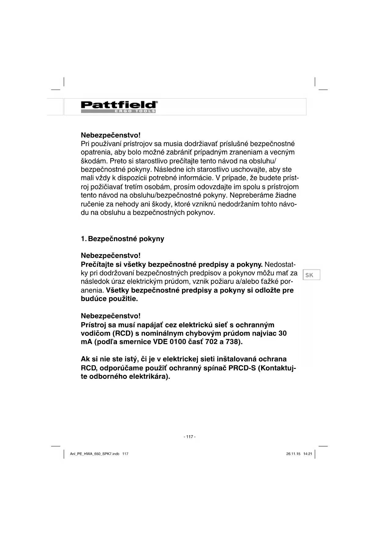 Nebezpečenstvo! Prečítajte si všetky bezpečnostné predpisy a pokyny. Nedostat- ky pri dodržovaní bezpečnostných predpisov a pokynov môžu mať za následok úraz elektrickým prúdom, vznik požiaru a/alebo ťažké por- anenia. Všetky bezpečnostné predpisy a pokyny si odložte pre budúce použitie. Nebezpečenstvo! Prístroj sa musí napájať cez elektrickú sieť s ochranným vodičom (RCD) s nominálnym chybovým prúdom najviac 30 mA (podľa smernice VDE 0100 časť 702 a 738). Ak si nie ste istý, či je v elektrickej sieti inštalovaná ochrana RCD, odporúčame použiť ochranný spínač PRCD-S (Kontaktuj- te odborného elektrikára). Anl_PE_HWA_650_SPK7.indb 117Anl_PE_HWA_650_SPK7.indb 117 26.11.15 14:2126.11.15 14:21SK