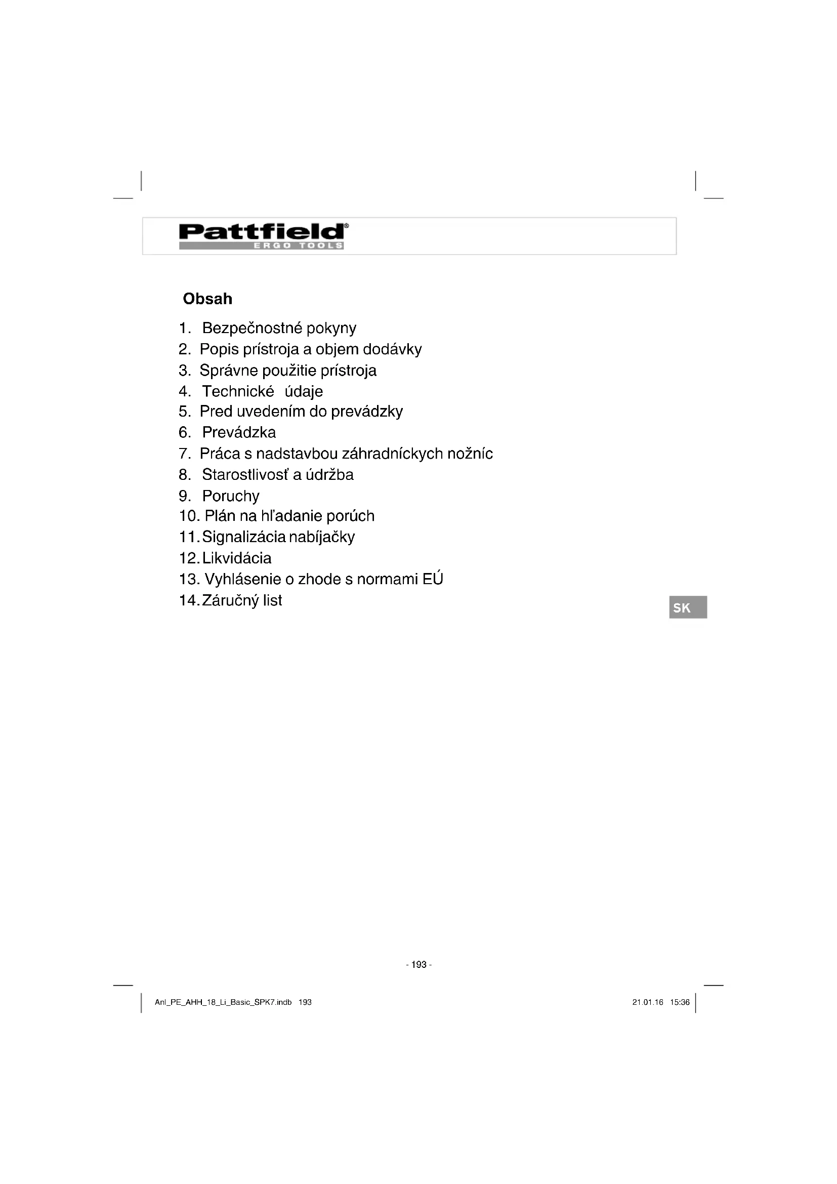 PE-AHH 18 Li Basic - Nožnice na živý plot Pattfield - Bezplatný návod na obsluhu