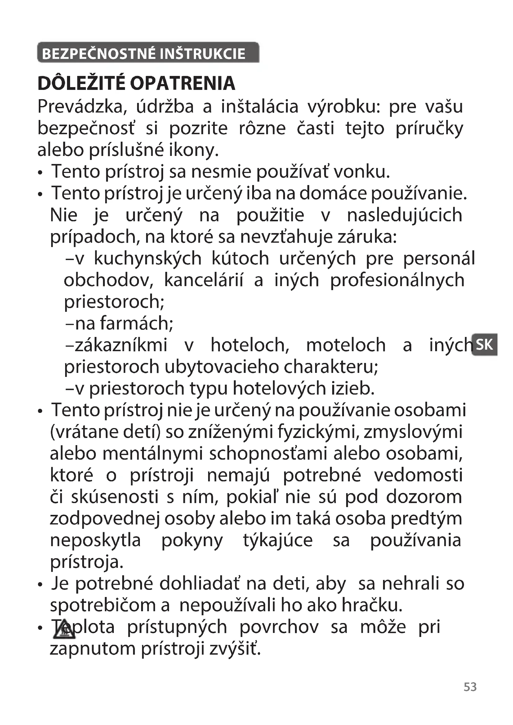 - Tento prístroj môžu používať deti vo veku 8 rokov a staršie a osoby so zníženými fyzickými, zmyslovými alebo mentálnymi schopnosťami, ak sú dostatočne poučené alebo informované o správnom používaní pristroja a poznajú súvisiace riziká. Čistenie a údržbu prístroja nesmú vykonávať 54SK deti, ktoré sú mladšie ako 8 rokov a bez dozoru. Prístroj a jeho kábel držte mimo dosahu detí mladších ako 8 rokov.
