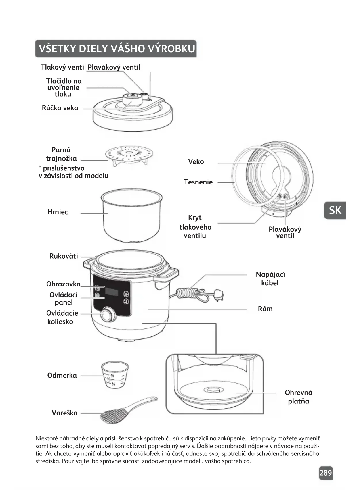 Ovládací panel Hrniec Parná trojnožka Rukoväti Obrazovka Ovládacie koliesko Odmerka Vareška Ohrevná platňa Napájací kábel Rám Rúčka veka Tlačidlo na uvoľnenie tlaku Tlakový ventil Plavákový ventil Plavákový ventil Tesnenie Kryt tlakového ventilu Veko