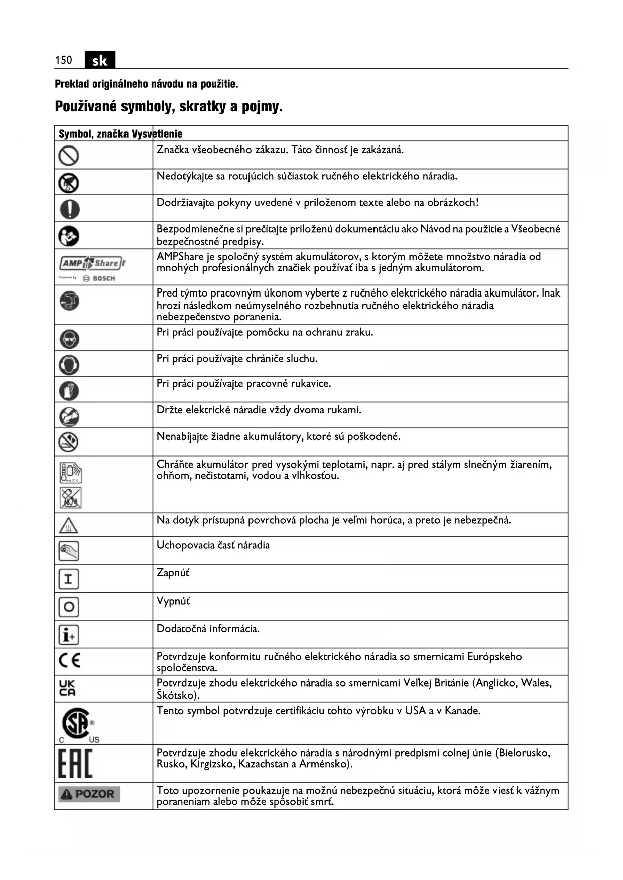 Preklad originálneho návodu na použitie. Používané symboly, skratky a pojmy. Symbol, značka Vysvetlenie Značka všeobecného zákazu. Táto činnosť je zakázaná. Nedotýkajte sa rotujúcich súčiastok ručného elektrického náradia. Dodržiavajte pokyny uvedené v priloženom texte alebo na obrázkoch! Bezpodmienečne si prečítajte priloženú dokumentáciu ako Návod na použitie a Všeobecné bezpečnostné predpisy. AMPShare je spoločný systém akumulátorov, s ktorým môžete množstvo náradia od mnohých profesionálnych značiek používať iba s jedným akumulátorom. Pred týmto pracovným úkonom vyberte z ručného elektrického náradia akumulátor. Inak hrozí následkom neúmyselného rozbehnutia ručného elektrického náradia nebezpečenstvo poranenia. Pri práci používajte pomôcku na ochranu zraku. Pri práci používajte chrániče sluchu. Pri práci používajte pracovné rukavice. Držte elektrické náradie vždy dvoma rukami. Nenabíjajte žiadne akumulátory, ktoré sú poškodené. Chráňte akumulátor pred vysokými teplotami, napr. aj pred stálym slnečným žiarením, ohňom, nečistotami, vodou a vlhkosťou. Na dotyk prístupná povrchová plocha je veľmi horúca, a preto je nebezpečná. Uchopovacia časť náradia Zapnúť Vypnúť Dodatočná informácia. Potvrdzuje konformitu ručného elektrického náradia so smernicami Európskeho spoločenstva. Potvrdzuje zhodu elektrického náradia so smernicami Veľkej Británie (Anglicko, Wales, Škótsko). Tento symbol potvrdzuje certifikáciu tohto výrobku v USA a v Kanade. Potvrdzuje zhodu elektrického náradia s národnými predpismi colnej únie (Bielorusko, Rusko, Kirgizsko, Kazachstan a Arménsko). Toto upozornenie poukazuje na možnú nebezpečnú situáciu, ktorá môže viesť k vážnym poraneniam alebo môže spôsobiť smrť. max.50°C151