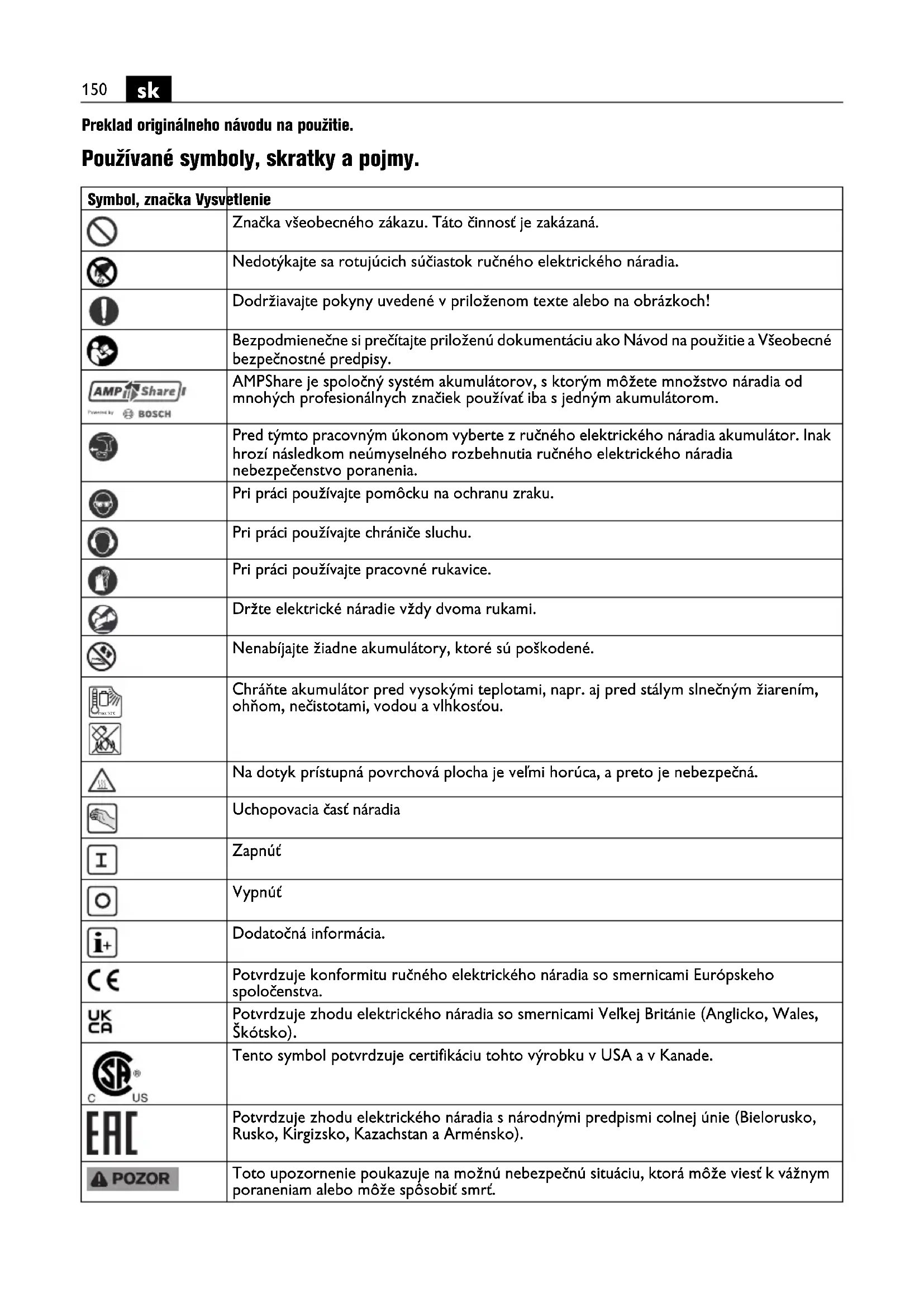 Preklad originálneho návodu na použitie. Používané symboly, skratky a pojmy. Symbol, značka Vysvetlenie Značka všeobecného zákazu. Táto činnosť je zakázaná. Nedotýkajte sa rotujúcich súčiastok ručného elektrického náradia. Dodržiavajte pokyny uvedené v priloženom texte alebo na obrázkoch! Bezpodmienečne si prečítajte priloženú dokumentáciu ako Návod na použitie a Všeobecné bezpečnostné predpisy. AMPShare je spoločný systém akumulátorov, s ktorým môžete množstvo náradia od mnohých profesionálnych značiek používať iba s jedným akumulátorom. Pred týmto pracovným úkonom vyberte z ručného elektrického náradia akumulátor. Inak hrozí následkom neúmyselného rozbehnutia ručného elektrického náradia nebezpečenstvo poranenia. Pri práci používajte pomôcku na ochranu zraku. Pri práci používajte chrániče sluchu. Pri práci používajte pracovné rukavice. Držte elektrické náradie vždy dvoma rukami. Nenabíjajte žiadne akumulátory, ktoré sú poškodené. Chráňte akumulátor pred vysokými teplotami, napr. aj pred stálym slnečným žiarením, ohňom, nečistotami, vodou a vlhkosťou. Na dotyk prístupná povrchová plocha je veľmi horúca, a preto je nebezpečná. Uchopovacia časť náradia Zapnúť Vypnúť Dodatočná informácia. Potvrdzuje konformitu ručného elektrického náradia so smernicami Európskeho spoločenstva. Potvrdzuje zhodu elektrického náradia so smernicami Veľkej Británie (Anglicko, Wales, Škótsko). Tento symbol potvrdzuje certifikáciu tohto výrobku v USA a v Kanade. Potvrdzuje zhodu elektrického náradia s národnými predpismi colnej únie (Bielorusko, Rusko, Kirgizsko, Kazachstan a Arménsko). Toto upozornenie poukazuje na možnú nebezpečnú situáciu, ktorá môže viesť k vážnym poraneniam alebo môže spôsobiť smrť. max.50°C151