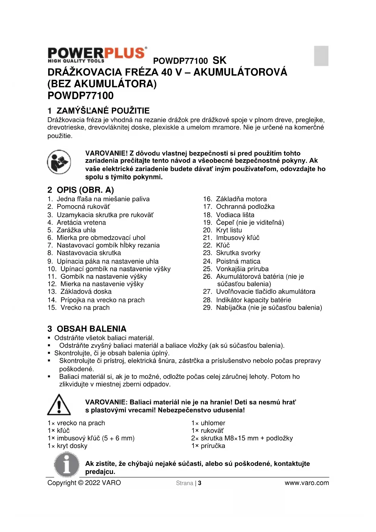 - Baliaci materiál si, ak je to možné, odložte počas celej záručnej lehoty. Potom ho zlikvidujte v miestnej zberni odpadov. VAROVANIE: Baliaci materiál nie je na hranie! Deti sa nesmú hrať s plastovými vrecami! Nebezpečenstvo udusenia! 1× vrecko na prach 1× kľúč 1× imbusový kľúč (5 + 6 mm) 1× kryt dosky 1× uhlomer 1× rukoväť 2× skrutka M8×15 mm + podložky 1× príručka Ak zistíte, že chýbajú nejaké súčasti, alebo sú poškodené, kontaktujte predajcu.POWDP77100 SK Copyright © 2022 VARO Strana | 4 www.varo.com 4 VYSVETLENIE SYMBOLOV V tomto návode a/alebo na stroji sa používajú nasledujúce symboly: