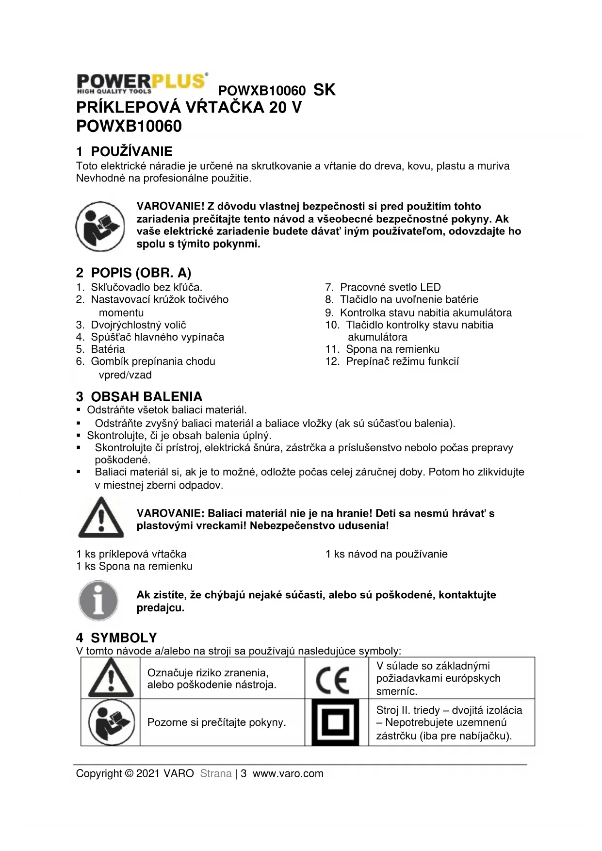 - Výstrahy, bezpečnostné opatrenia a pokyny opísané v tomto návode na použitie nemožno aplikovať na všetky možné podmienky a situácie, ktoré sa môžu vyskytnúť. Operátor musí vedieť, že zdravý úsudok a opatrnosť sú činitele, ktoré do tohto výrobku nemožno vložiť, ale musí ich mať operátor.POWXB10060 SK Copyright © 2021 VARO Strana | 7 www.varo.com 7 DOPLNKOVÉ BEZPEČNOSTNÉ POKYNY PRE BATÉRIE