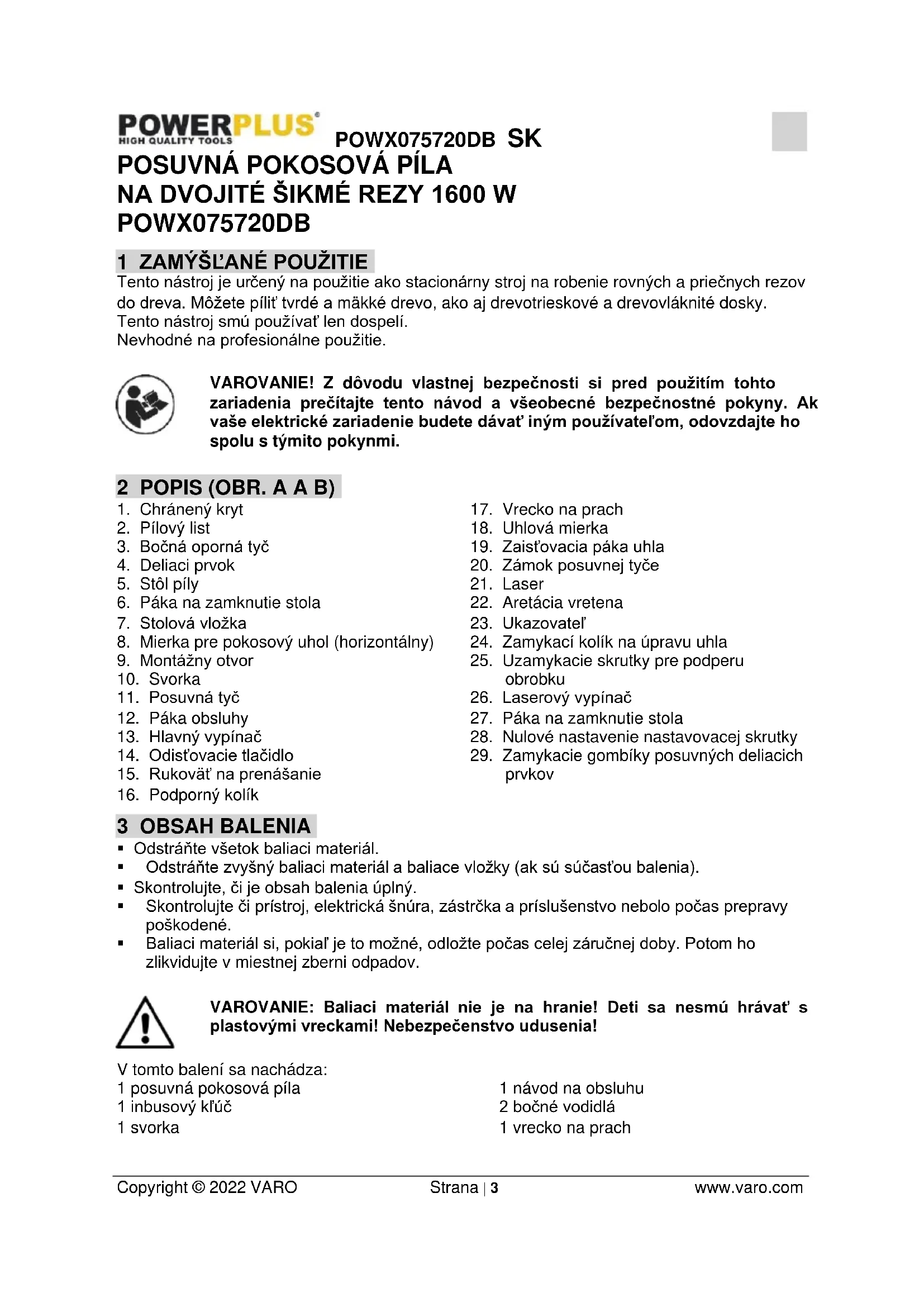 - Baliaci materiál si, pokiaľ je to možné, odložte počas celej záručnej doby. Potom ho zlikvidujte v miestnej zberni odpadov. VAROVANIE: Baliaci materiál nie je na hranie! Deti sa nesmú hrávať s plastovými vreckami! Nebezpečenstvo udusenia! V tomto balení sa nachádza: 1 posuvná pokosová píla 1 inbusový kľúč 1 svorka 1 návod na obsluhu 2 bočné vodidlá 1 vrecko na prachPOWX075720DB SK Copyright © 2022 VARO Strana | 4 www.varo.com Ak zistíte, že chýbajú nejaké súčasti, alebo sú poškodené, kontaktujte predajcu. 4 SYMBOLY V tomto návode a/alebo na stroji sa používajú nasledujúce symboly: