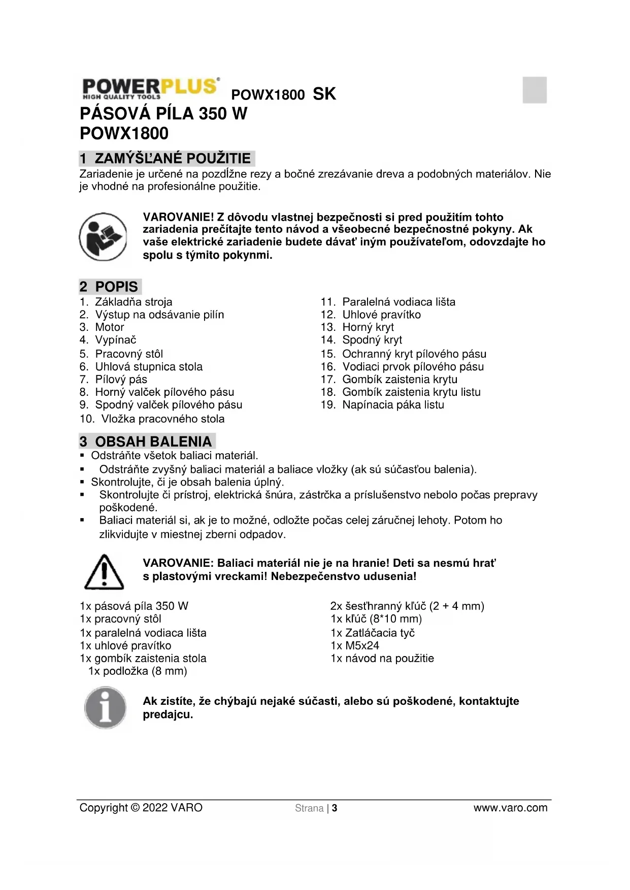 - Baliaci materiál si, ak je to možné, odložte počas celej záručnej lehoty. Potom ho zlikvidujte v miestnej zberni odpadov. VAROVANIE: Baliaci materiál nie je na hranie! Deti sa nesmú hrať s plastovými vreckami! Nebezpečenstvo udusenia! 1x pásová píla 350 W 1x pracovný stôl 1x paralelná vodiaca lišta 1x uhlové pravítko 1x gombík zaistenia stola 1x podložka (8 mm) 2x šesťhranný kľúč (2 + 4 mm) 1x kľúč (8*10 mm) 1x Zatláčacia tyč 1x M5x24 1x návod na použitie Ak zistíte, že chýbajú nejaké súčasti, alebo sú poškodené, kontaktujte predajcu.POWX1800 SK Copyright © 2022 VARO Strana | 4 www.varo.com 4 VYSVETLENIE SYMBOLOV V tomto návode a/alebo na stroji sa používajú nasledujúce symboly: