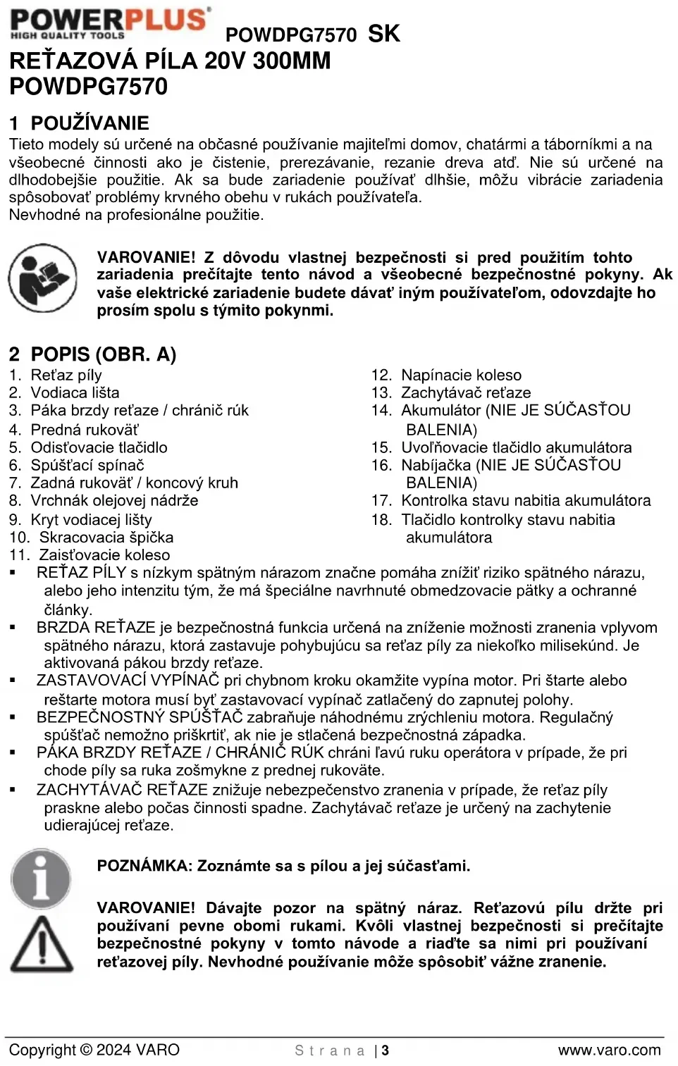 - ZACHYTÁVAČ REŤAZE znižuje nebezpečenstvo zranenia v prípade, že reťaz píly praskne alebo počas činnosti spadne. Zachytávač reťaze je určený na zachytenie udierajúcej reťaze. POZNÁMKA: Zoznámte sa s pílou a jej súčasťami. VAROVANIE! Dávajte pozor na spätný náraz. Reťazovú pílu držte pri používaní pevne obomi rukami. Kvôli vlastnej bezpečnosti si prečítajte bezpečnostné pokyny v tomto návode a riaďte sa nimi pri používaní reťazovej píly. Nevhodné používanie môže spôsobiť vážne zranenie.POWDPG7570 SK Copyright © 2024 VARO S t r a n a | 4 www.varo.com VAROVANIE! Keď používate benzínové nástroje, vždy sa riaďte základnými bezpečnostnými pokynmi, vrátane nasledujúcich. Znížite tak riziko vážneho osobného zranenia a/alebo poškodenia nástroja. 3 OBSAH BALENIA