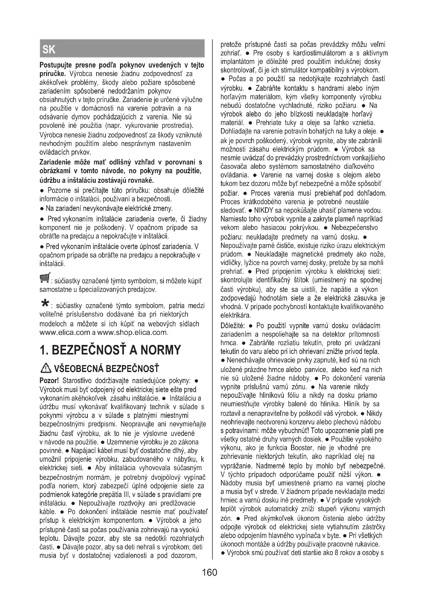 Před kontaktováním servisního oddělení 1.Zkontrolujte, zda problém nemůžete vyřešit sami podle pokynů uvedených ve “Vyhledávání závad”. 2.Vypněte a znovu zapněte přístroj a zkontrolujte, zda závada přetrvává. Pokud i po těchto kontrolách závada bude přetrvávat, kontaktujte nejbližší servisní středisko. 159SK Postupujte presne podľa pokynov uvedených v tejto príručke. Výrobca nenesie žiadnu zodpovednosť za akékoľvek problémy, škody alebo požiare spôsobené zariadením spôsobené nedodržaním pokynov obsiahnutých vtejto príručke. Zariadenie je určené výlučne na použitie v domácnosti na varenie potravín a na odsávanie dymov pochádzajúcich z varenia. Nie sú povolené iné použitia (napr. vykurovanie prostredia). Výrobca nenesie žiadnu zodpovednosť za škody vzniknuté nevhodným použitím alebo nesprávnym nastavením ovládacích prvkov. Zariadenie môže mať odlišný vzhľad v porovnaní s obrázkami v tomto návode, no pokyny na použitie, údržbu a inštaláciu zostávajú rovnaké. ● Pozorne si prečítajte túto príručku: obsahuje dôležité informácie o inštalácii, používaní a bezpečnosti. ● Na zariadení nevykonávajte elektrické zmeny. ● Pred vykonaním inštalácie zariadenia overte, či žiadny komponent nie je poškodený. V opačnom prípade sa obráťte na predajcu a nepokračujte v inštalácii. ● Pred vykonaním inštalácie overte úplnosť zariadenia. V opačnom prípade sa obráťte na predajcu a nepokračujte v inštalácii. : súčiastky označené týmto symbolom, si môžete kúpiť samostatne u špecializovaných predajcov. : súčiastky označené týmto symbolom, patria medzi voliteľné príslušenstvo dodávané iba pri niektorých modeloch a môžete si ich kúpiť na webových sídlach www.elica.com a www.shop.elica.com.