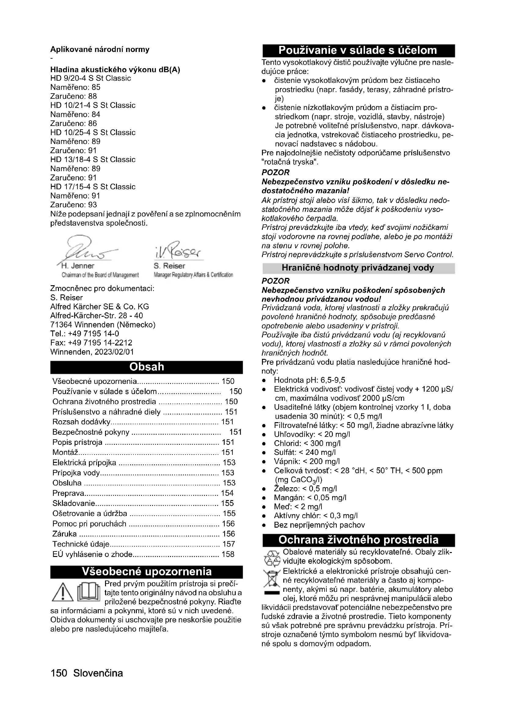 Hladina akustického výkonu dB(A) HD 9/20-4 S St Classic Naměřeno: 85 Zaručeno: 88 HD 10/21-4 S St Classic Naměřeno: 84 Zaručeno: 86 HD 10/25-4 S St Classic Naměřeno: 89 Zaručeno: 91 HD 13/18-4 S St Classic Naměřeno: 89 Zaručeno: 91 HD 17/15-4 S St Classic Naměřeno: 91 Zaručeno: 93 Níže podepsaní jednají z pověření a se zplnomocněním představenstva společnosti. Zmocněnec pro dokumentaci: S. Reiser Alfred Kärcher SE & Co. KG Alfred-Kärcher-Str. 28 - 40 71364 Winnenden (Německo) Tel.: +49 7195 14-0 Fax: +49 7195 14-2212 Winnenden, 2023/02/01 Obsah Všeobecné upozornenia Pred prvým použitím prístroja si prečí- tajte tento originálny návod na obsluhu a priložené bezpečnostné pokyny. Riaďte sa informáciami a pokynmi, ktoré sú v nich uvedené. Obidva dokumenty si uschovajte pre neskoršie použitie alebo pre nasledujúceho majiteľa. Používanie v súlade s účelom Tento vysokotlakový čistič používajte výlučne pre nasle- dujúce práce: ●čistenie vysokotlakovým prúdom bez čistiaceho prostriedku (napr. fasády, terasy, záhradné prístro- je) ●čistenie nízkotlakovým prúdom a čistiacim pro- striedkom (napr. stroje, vozidlá, stavby, nástroje) Je potrebné voliteľné príslušenstvo, napr. dávkova- cia jednotka, vstrekovač čistiaceho prostriedku, pe- novací nadstavec s nádobou. Pre najodolnejšie nečistoty odporúčame príslušenstvo "rotačná tryska". POZOR Nebezpečenstvo vzniku poškodení v dôsledku ne- dostatočného mazania! Ak prístroj stojí alebo visí šikmo, tak v dôsledku nedo- statočného mazania môže dôjsť k poškodeniu vyso- kotlakového čerpadla. Prístroj prevádzkujte iba vtedy, keď svojimi nožičkami stojí vodorovne na rovnej podlahe, alebo je po montáži na stenu v rovnej polohe. Prístroj neprevádzkujte s príslušenstvom Servo Control. Hraničné hodnoty privádzanej vody POZOR Nebezpečenstvo vzniku poškodení spôsobených nevhodnou privádzanou vodou! Privádzaná voda, ktorej vlastnosti a zložky prekračujú povolené hraničné hodnoty, spôsobuje predčasné opotrebenie alebo usadeniny v prístroji. Používajte iba čistú privádzanú vodu (aj recyklovanú vodu), ktorej vlastnosti a zložky sú v rámci povolených hraničných hodnôt. Pre privádzanú vodu platia nasledujúce hraničné hod- noty: ● Hodnota pH: 6,5-9,5 ● Elektrická vodivosť: vodivosť čistej vody + 1200 µS/ cm, maximálna vodivosť 2000 µS/cm ● Usaditeľné látky (objem kontrolnej vzorky 1 l, doba usadenia 30 minút): < 0,5 mg/l ● Filtrovateľné látky: < 50 mg/l, žiadne abrazívne látky ● Uhľovodíky: < 20 mg/l ● Chlorid: < 300 mg/l ● Sulfát: < 240 mg/l ● Vápnik: < 200 mg/l ● Celková tvrdosť: < 28 °dH, < 50° TH, < 500 ppm (mg CaCO