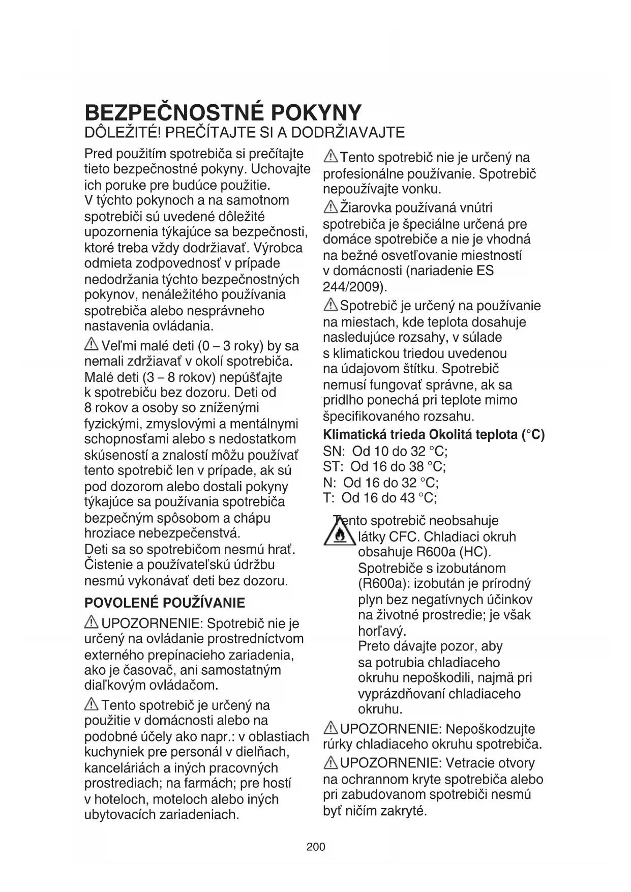 UPOZORNENIE: Spotrebič nie je určený na ovládanie prostredníctvom externého prepínacieho zariadenia, ako je časovač, ani samostatným diaľkovým ovládačom. Tento spotrebič je určený na použitie v domácnosti alebo na podobné účely ako napr.: v oblastiach kuchyniek pre personál v dielňach, kanceláriách a iných pracovných prostrediach; na farmách; pre hostí v hoteloch, moteloch alebo iných ubytovacích zariadeniach. Tento spotrebič nie je určený na profesionálne používanie. Spotrebič nepoužívajte vonku. Žiarovka používaná vnútri spotrebiča je špeciálne určená pre domáce spotrebiče a nie je vhodná na bežné osvetľovanie miestností v domácnosti (nariadenie ES 244/2009). Spotrebič je určený na používanie na miestach, kde teplota dosahuje nasledujúce rozsahy, v súlade s klimatickou triedou uvedenou na údajovom štítku. Spotrebič nemusí fungovať správne, ak sa pridlho ponechá pri teplote mimo špecikovaného rozsahu. Klimatická trieda Okolitá teplota (°C) SN: Od 10 do 32 °C; ST: Od 16 do 38 °C; N: Od 16 do 32 °C; T: Od 16 do 43 °C; Tento spotrebič neobsahuje látky CFC. Chladiaci okruh obsahuje R600a (HC). Spotrebiče s izobutánom (R600a): izobután je prírodný plyn bez negatívnych účinkov na životné prostredie; je však horľavý. Preto dávajte pozor, aby sa potrubia chladiaceho okruhu nepoškodili, najmä pri vyprázdňovaní chladiaceho okruhu. UPOZORNENIE: Nepoškodzujte rúrky chladiaceho okruhu spotrebiča. UPOZORNENIE: Vetracie otvory na ochrannom kryte spotrebiča alebo pri zabudovanom spotrebiči nesmú byť ničím zakryté.201 UPOZORNENIE: Na zrýchlenie procesu odmrazovania nepoužívajte mechanické, elektrické ani chemické prostriedky nad rámec tých, ktoré odporúča výrobca. UPOZORNENIE: Nepoužívajte ani neumiestňujte elektrické zariadenia do vnútra priečinkov spotrebiča, pokiaľ nejde o typ, ktorý výslovne povolil výrobca. UPOZORNENIE: pomôcky na tvorbu ľadu a výdajníky vody, ktoré nie sú priamo pripojené k vodovodu, sa musia plniť výlučne pitnou vodou. V blízkosti spotrebiča neskladujte výbušné látky, ako sú aerosolové nádoby a na spotrebič nikdy neklaďte ani v jeho blízkosti nepoužívajte benzín alebo iné horľavé látky. Neprehltávajte obsah (netoxický) chladiacich vložiek (dodávaných k niektorým modelom). Nekonzumujte kocky ľadu ani ľadové lízanky bezprostredne po vytiahnutí z mrazničky, pretože vám môžu spôsobiť omrzliny. V prípade produktov využívajúcich vzduchový lter vnútri prístupného krytu ventilátora bude počas prevádzky chladničky lter vždy nainštalovaný. V priestore mrazničky neuchovávajte sklenené nádoby s tekutinami, pretože môžu prasknúť. Ventilátor (ak je súčasťou výbavy) neblokujte potravinami. Po vložení potravín skontrolujte, či sa dvierka priestorov správne zatvárajú. Platí to najmä o dvierkach mrazničky. Poškodené tesnenie je potrebné vymeniť čo najskôr. Chladiaci priestor využívajte len na uskladnenie čerstvých potravín a mraziaci priestor výlučne na uchovávanie mrazených potravín, mrazenie čerstvých potravín a výrobu ľadu. Neskladujte nezabalené potraviny v priamom kontakte s vnútornými povrchmi chladiaceho alebo mraziaceho priestoru. Spotrebiče sú vybavené špeciálnymi priečinkami (priečinok na čerstvé potraviny, nula stupňová skrinka...). Pokiaľ nie je v konkrétnej brožúrke k spotrebiču uvedené inak, možno ich vybrať, pričom sa výkon nezmení. C-pentán sa používa ako nadúvadlo v izolačnej pene a ide o horľavý plyn.