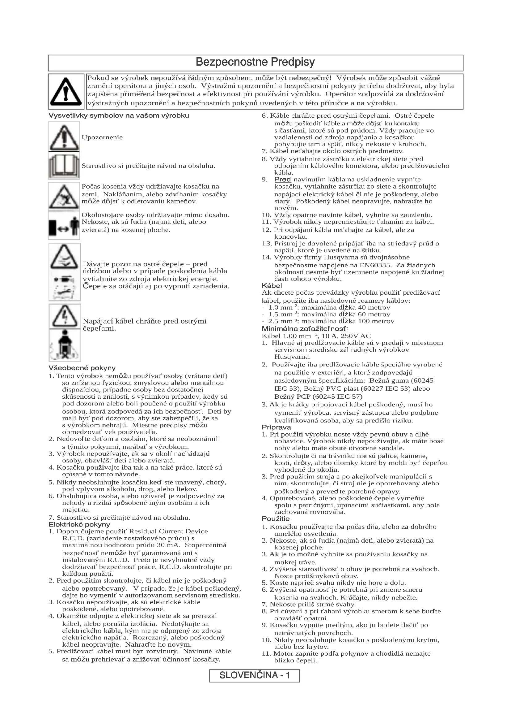 dozviete na miestnom úrade, v organizácii, ktorá zabezpečuje likvidáciu domáceho odpadu alebo v predajni, kde ste výrobok kúpili. Záruka a záručná politika Firma Husqvarna Ltd. prostredníctvom svojich autorizovaných servisných stredísk vykoná opravu, alebo výmenu poško- deného výrobku bezplatne ak uplatní zákazník svoj nárok v čase platnosti záručnej doby a sú splnené nasledovné pod- mienky: a) závada je nahlásená okamžite u predajcu výrobku b) bol predložený riadne vyplnený záručný list a pokladničný doklad c) závada nebola spôsobená nesprávnym používaním, ned- balosťou alebo chybným nastavením zo strany užívateľa d) závada nenastala následkom bežného opotrebovania e) stroj nebol nastavovaný opravovaný, alebo rozoberaný nikým iným ako osobou autorizovanou firmou Husqvarna Ltd. f) stroj nebol nikdy prenajímaný g) stroj je stále vo vlastníctve pôvodného majiteľa (kupu- júceho) h) stroj nebol používaný mimo územia Slovenskej republiky